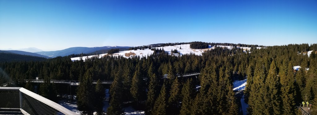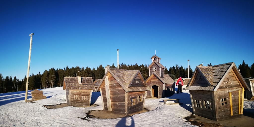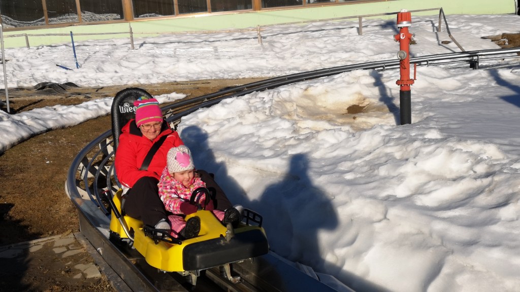 Rogla pa sicer ponuja toliko več od smučanja, da je skoraj greh, če se tja odpravite le na dnevno smučanje. Tako smo v popoldanskem času po kosilu obiskali novejšo turistično atrakcijo Pot med krošnjami, ki ponuja sprehod po malo več kot 1000 m dolgi, varovani poti med krošnjami smrek približno 20 metrov na tlemi. Pot poleg lepih razgledov ponuja tudi nekaj informacij o rastlinah in kamninah na tem področju, proti koncu poti pa se morate še obvezno povzpeti na 37 metrov visoki stolp s katerega se odkrivajo dih jemajoči razgledi na vse strani. Po obveznem fotografiranju na vrhu smo se spustili nazaj na trdna tla in se podali še na Zlodejevo, kjer pozimi in poleti ponujajo adrenalinsko sankanje. Moram priznati, da je proga res adrenalinska, še posebej, če se ne uporablja zavor. Proga je tudi precej dolga, tako, da je vredna svojega denarja. Na koncu proge se voz premišljeno natakne na vlečnico, ki ga povleče nazaj proti izhodišču. Poleg tega se otroci lahko zabavajo na igralih, na vrhu Uniorčka pa je še Pohorska vasica, ki jo sestavlja 9 lesenih hišk in cerkvica.
