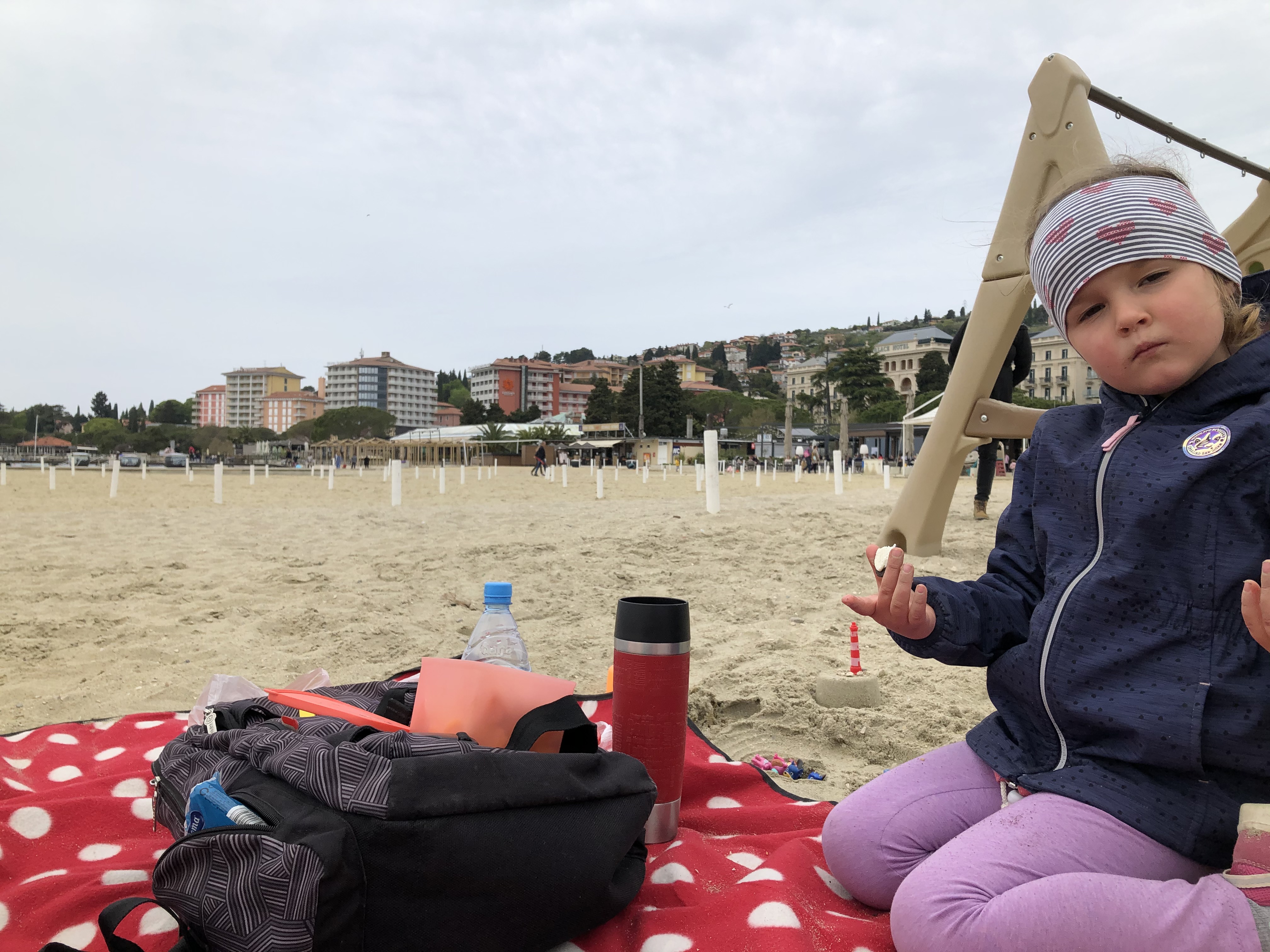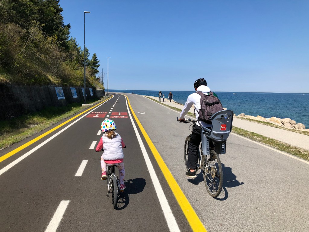Noč je bila zelo mirna, brez neurbanega petja ali drugih živalskih zvokov. Celo promet iz bližnje hitre ceste je bil komaj zaznaven. Skratka, zjutraj smo se zbudili spočiti in dan je veliko obetal. Ni ga čez dober zajtrk pred avtodomom, ki da potrebno energijo za raziskovanja in nove dogodivščine. Imeli smo samo en manjši problem – Laura je imela že nekaj dni prav grd kašelj in tudi sprememba okolja z morskim zrakom ni naredila nobene spremembe. Še več, zdelo se nama je, da je zelo ‘cunjasta’, brez prave energije in smo razmišljali celo o tem, da se kar poberemo domov. No, na srečo smo vztrajali saj potem, ko smo se enkrat odpravili na pot s kolesom, je Laura lepo sledila in ni bilo videti, da bi jo karkoli motilo. Razgled na sinje modro morje na poti proti Izoli očitno deluje zdravilno. Pot je zelo široka, vzorno urejena, posebej dvosmerno kolesarska steza in posebej dovolj široka pot za pešce. V Izoli smo se zapeljali do svetilnika, kjer smo parkirali in se predali uživanju. V tistem času je obalna regija veljala za tisto, ki ima najugodnejšo epidemiološko sliko, zato so bile terase lokalov odprte. Pivo in pica po skoraj pol leta je delovalo nekako nerealno in človek se mora temu prav ponovno privaditi. Je pa pasalo, zelo. Ko smo se popoldne vrnili v Koper smo zaokrožili še proti obalni promenadi, kjer se je trlo ljudi. Izgledalo je, kot da v mestu poteka kakšen hud dogodek, kot včasih koprska noč. Vrstam ljudi, ki so čakali pred lokali na prosto mizo ni bilo videti konca. Mi smo pustili bicikle in naredili še en krog po starem delu Kopra ter špilali turiste z ruzaki in fotoaparati.