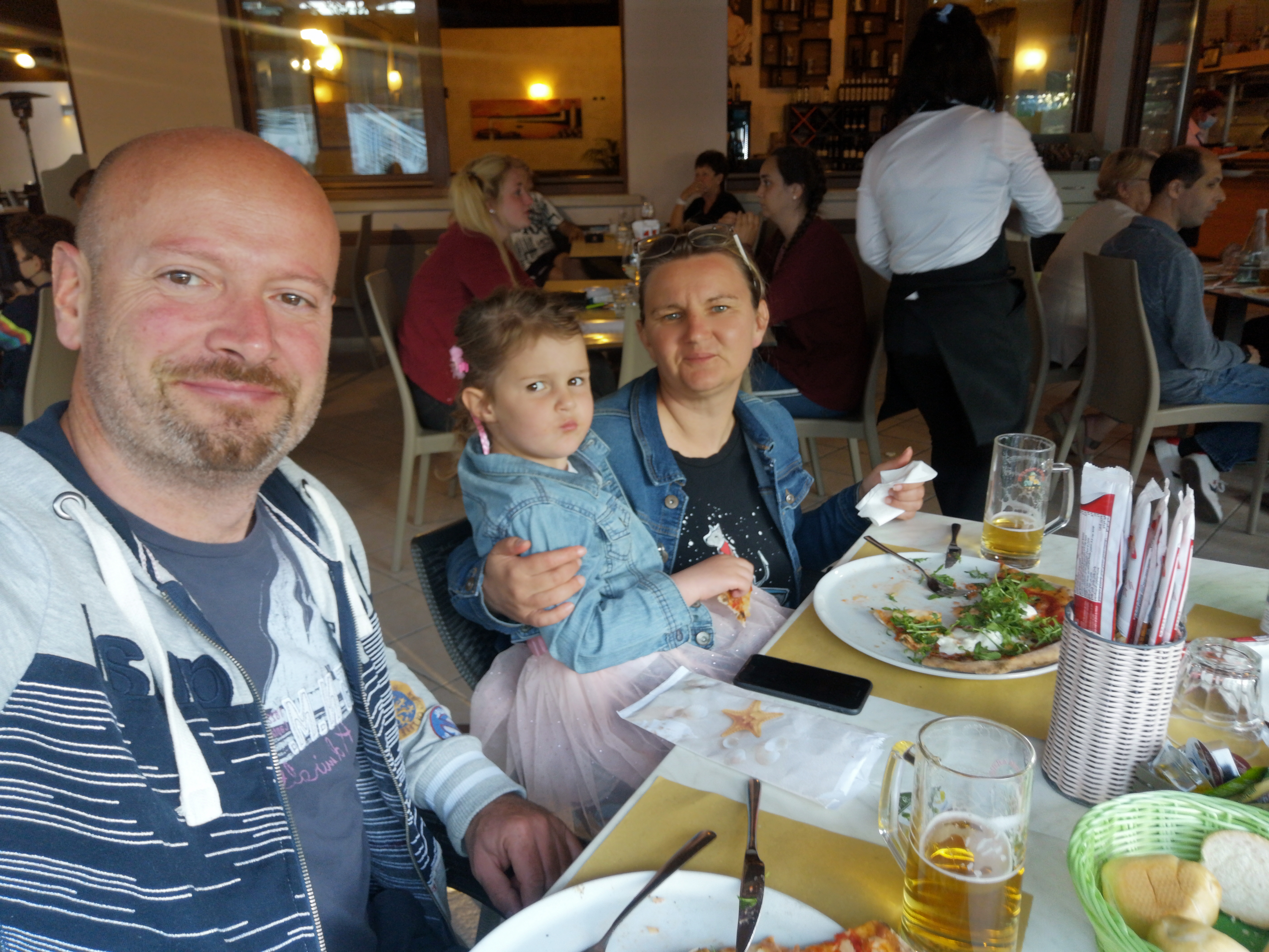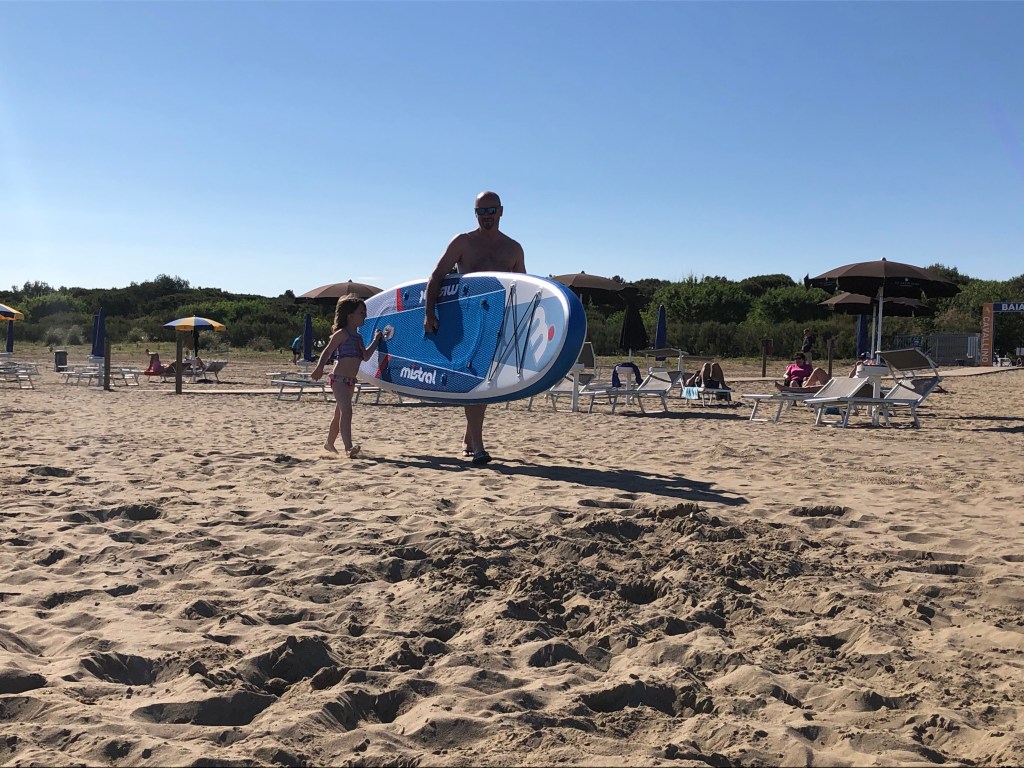 Parcela ravna, na njej elektrika in voda, prostora ogromno okoli, kar pomeni, da smo se res udobno namestili in zvlekli iz prtljažnika vso možno kramo, vključno z novim supom, ki je potrpežljivo čakal na prostovoljca, da bi zasijal v vsej svojih napihljivi podobi. Po obveznih špagetih smo si nadeli kopalke, da bi preverili plažo in z večjo previdnostjo preizkusili temperaturo morja, za katerega smo po dolgem, hladnem in deževnem obdobju upravičeno pričakovali, da nas bo pošteno streslo. No, na presenečenje vseh smo dejansko brez večjih težav zaplavali…oziroma bolje rečeno simulirali plavanje, saj bi za plavanje primerno globoko vodo moral prehoditi vsaj nadaljnjih 50 metrov od obale. Ravno zaradi plitkega morja je bila temperatura precej znosna. Saša je sicer bolj zmrzljive sorte in se prvi dan ni popolnoma predala morju. Ugotovili smo, da dejansko občutimo prve okuse poletja, ki ga mi in naš Levček z veliko nestrpnostjo pričakujemo. Zvečer smo se prav po leno podali v edino restavracijo v kampu, kjer smo opazili prave italijanske pice. Poleg obveznega mrzlega piva. Naša tamala pa je prišla na svoj račun ob deveti uri zvečer, ko se je v neposredni bližini pričel mini disco, ki je privabil skoraj vse otroke v kampu. Navajeni predvsem na hrvaške verzije mini disca, se nam je zdelo osvežujoče, da se je večina otroških pesmi vrtela v italijanščini in hitro smo vzeli nekaj pesmi za naše.