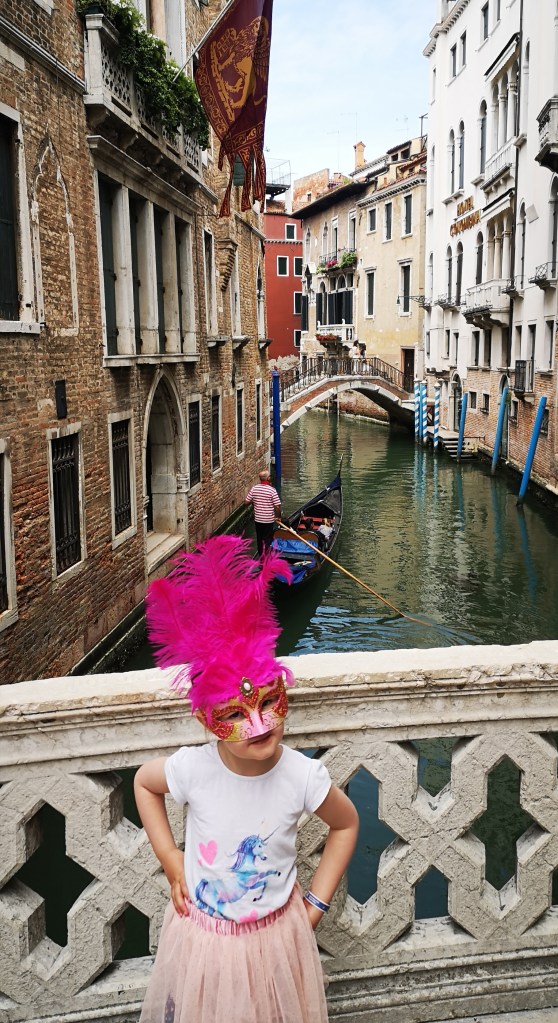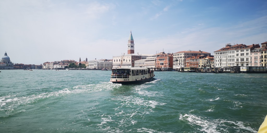 Naslednji dan je bil predviden za izlet v Benetke, ki so od kampa oddaljene slabih 15 km zračne linije. Izhodišče za prečkanje z ladjo je Punta Sabbioni do katere se lahko pride s kolesi (res vzorno urejene kolesarske poti vzdolž glavne ceste) ali pa z uporabo lokalnega avtobusa, ki pa ne ustavi ob kampu kot je bilo to včasih, ampak je potrebno kakšen kilometer peš do glavne ceste, kjer se nahajata postaji v obe smeri. Na recepciji kampa so nam uredili nakup kombinirane vozovnice avtobus-vaporetto v obe smeri, mislim, da je bila cena okoli 40 eur (otrok do 6.leta starosti ima ladjico zastonj). Vožnja z busom traja slabih 10 minut, vožnja s trajektom pa približno 40 minut, vmes ima postajo na Lidu. Končna postaja v Benetkah je tam, kjer ustavlja večino vaporettov, nedaleč stran od trga Svetega Marka.