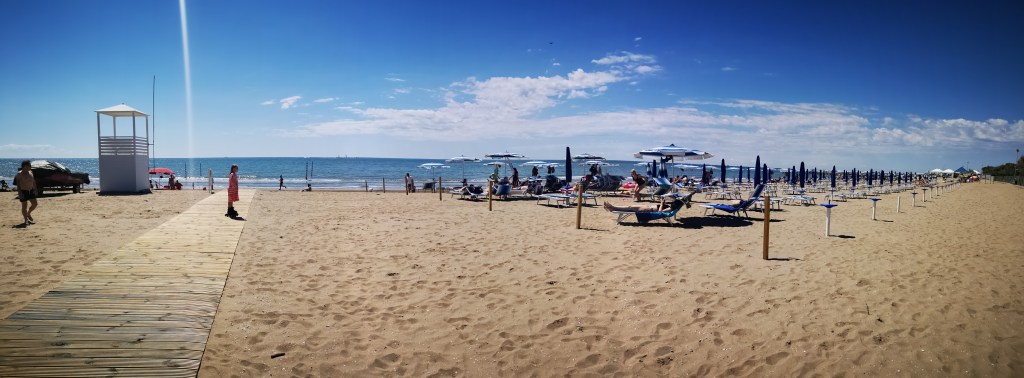 Sam Cavallino nas je razočaral – nič posebnega, brez kakšnega centra ali trga z lokali in trgovinicami, zato smo zavili nazaj proti obali in sklenili pogledati kako zgleda nek 5-zvezdični kamp. Z našimi kolesi smo uspešno prečili recepcijo Europa Camping Village, ki je dajal videz urejenosti, ponujal je tudi kar nekaj sence, plaža pa je bila tako ali tako podobna – na megatone peska in plitko morje.