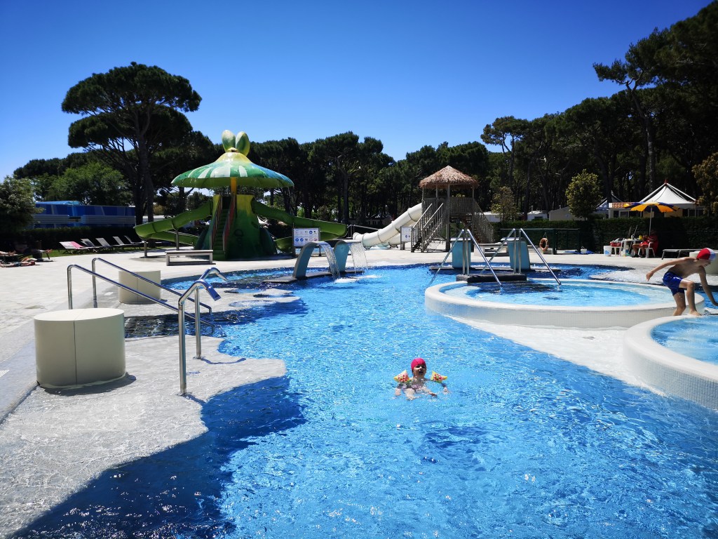 Preden se odpravimo proti Gradežu morda še beseda ali dve o samem kampu Cavallino. Gre res za družinski kamp, kjer je precej umirjeno. Parcele so na ravnem terenu, del kampa pri plaži ima manj sence, večji del kampa pa ponuja dobro senco borovcev. Kamp ponuja vse za zelo kvalitetno preživljanje počitnic, med drugim velik bazenski kompleks s tobogani, kjer pa voda ni ogrevana kot npr. v Lignanu. V času našega bivanja so urejali še zadnje podrobnosti velikega SPA kompleksa z notranjem bazenom, savnami, masažnimi in drugimi wellness storitvami. Ima dobro založeno trgovino, kjer prodajajo celo Union pivo (in radler!), otroško igralnico in igrišče z igrali, čez dan in zvečer animatorsko ekipo. Vse našteto pa na žalost stane, zato smo za tri nočitve plačali 167 eur (3x parcela z vodo in elektriko, cona A). Na kartico Avtokampi.si se sicer lahko dobi dodaten popust, ki pa ga v našem primeru ni bilo, saj smo bili ravno v obdobju binkoštnih počitnic in te so izvzete.