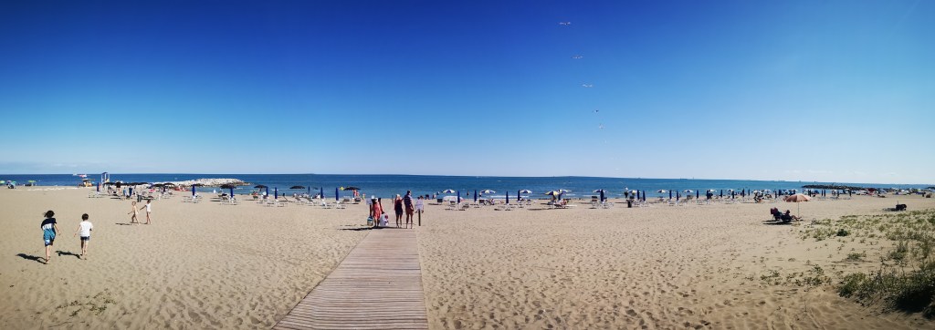 Po nabavi špeže (kaj, na primorskem smo) smo naslednji trenutek že prečkali mejo in srce je veselo igralo, ko je naš Levček požiral kilometer za kilometrom italijanske autostrade. Mahnili smo jo kar direktno proti Cavallinu, mestecu na nekakšnem polotoku v beneški laguni na katerem se sicer nahaja večje mesto Lido di Jesolo. Na priporočilo naše najboljše spletne strani za kamperje Avtokampi.si smo se odločili za družinski kamp Camping Cavallino, ki tako kot večina kampov tukaj leži direktno na tipični italijanski peščeni obali. Predhodno nismo nič rezervirali, nato pa so nas na recepciji skoraj prestrašili, da so precej polni. Sicer prijazna gospa nam je napisala katere parcele ob obali so še proste in imeli smo kar srečo, da smo našli prostrano parcelo, od katere je bilo le nekaj metrov do peska in morja.