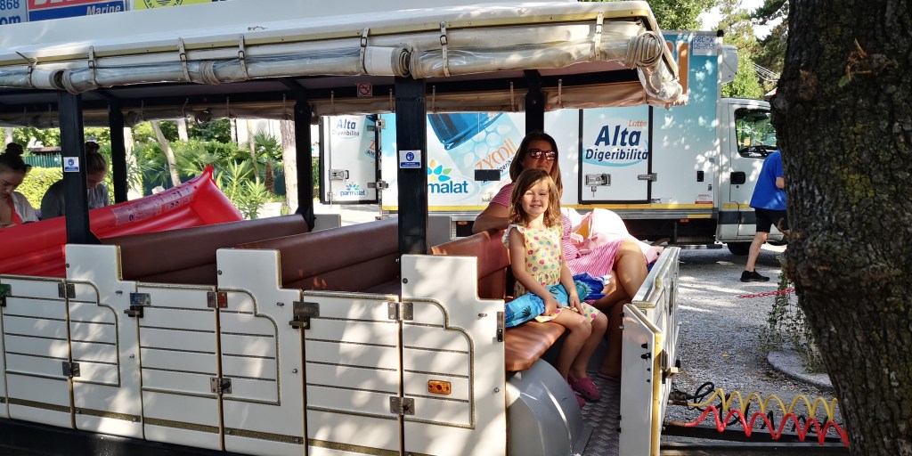 Naslednji dan smo se najprej postavili v vrsto pred trgovino, ki se odpre ob osmih zjutraj, potem pa smo ob devetih že čakali na voznika, ki bo malo vlakovno kompozicijo popeljal proti obali. Na končni postaji vlakca se lahko odpravite na manjšo plažo, ki se nahaja tik pod kampom ali v drugo smer, kjer po petih minutah hoje pridete do večje plaže, kjer kraljujejo ležalniki in senčniki, kot je pravilo v Italiji. Morje je bilo zelo toplo, vendar čisto, bilo pa je že kar veliko kopalcev za takšno zgodno uro. Ne predstavljam si, kako je šele kasneje čez dan. Popoldanski del sobote smo tako raje preživeli v kampu pred avtodomom oz. na bazenu, kjer se je ob našem prihodu izvajala aqua aerobika. Tudi sicer je bilo za animacijo relativno dobro poskrbljeno – kot že omenjeno se dvakrat na dan lahko razgibate v bazenu, zvečer pa pridejo na svoj račun najmlajši z mini discom.