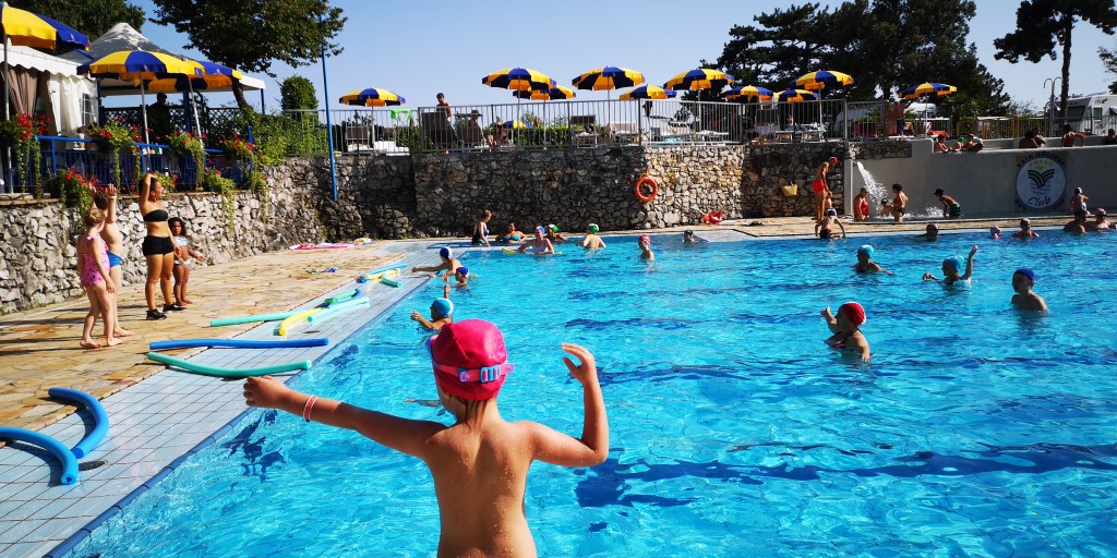 Kot sem že omenil ima kamp velik bazen in nekaj manjših, v katere smo navdušeno skočili, saj je bila popoldanska temperatura zraka precej nad 30 stopinj. Na bazenu se odvija vodna aerobika dopoldne in popoldne, odprt je klasično od 10.00 do 19.00 ure in ja, ker smo v Italiji je za kopalce obvezna kopalna kapica. Tudi za nas brez las, da ne bo pomote. Ob bazenu je nekaj ležalnikov, več jih je na zgornjem platoju in so skupaj s senčnikom plačljivi.