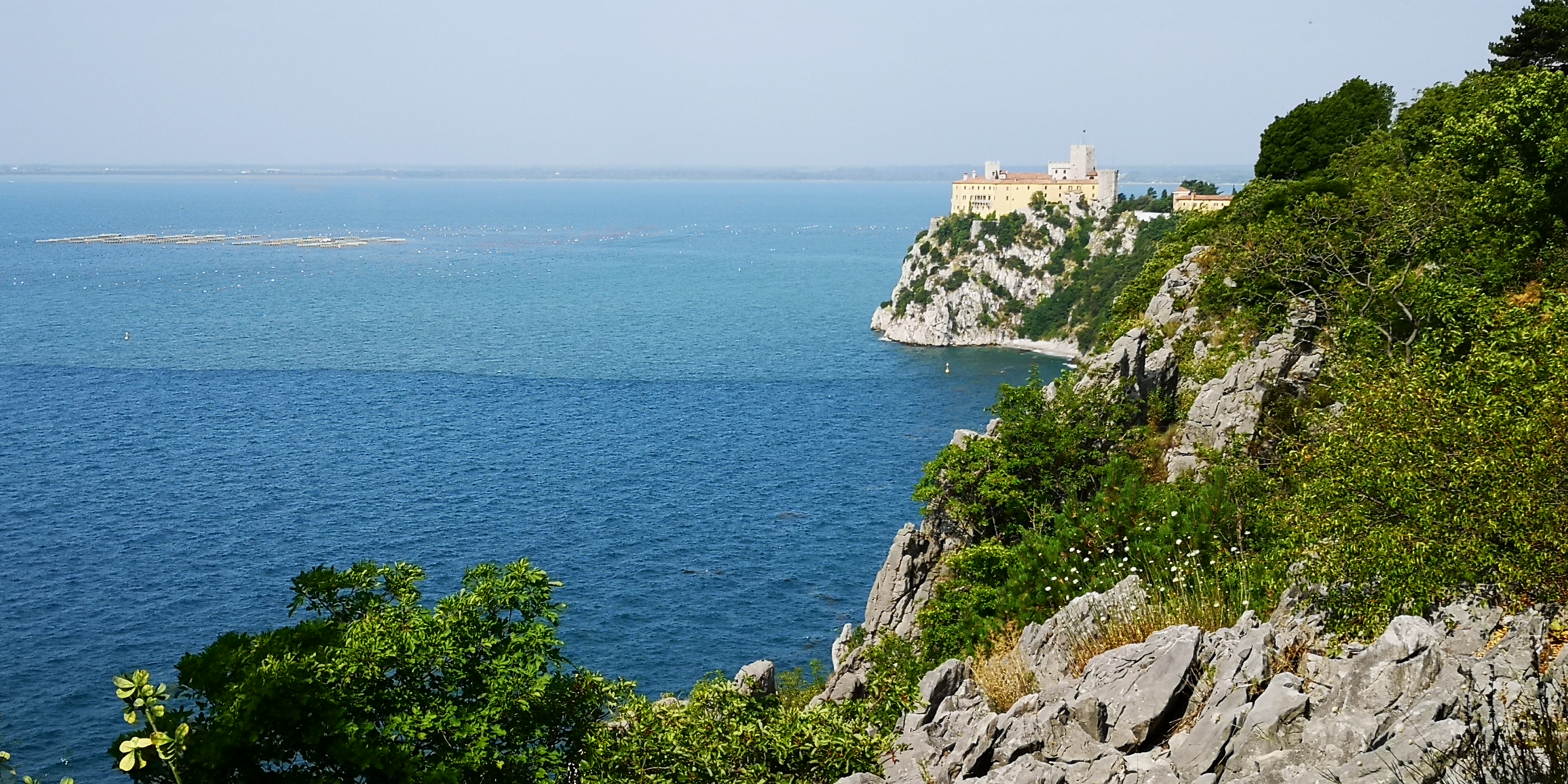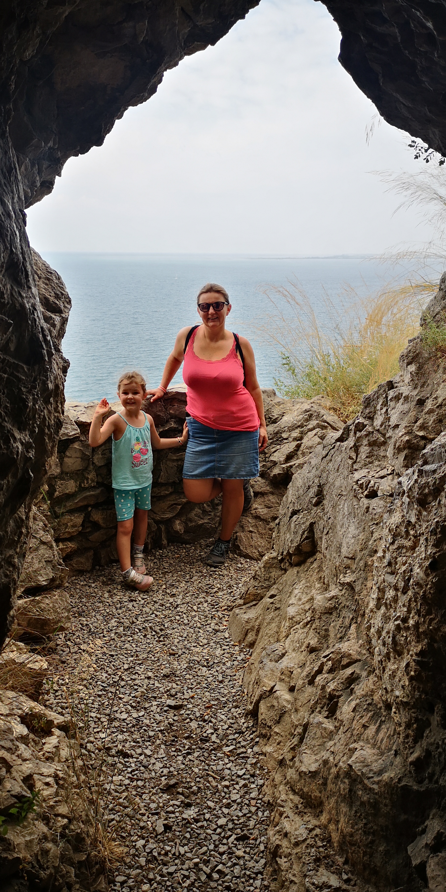 V nedeljo pa si zaželeli malo pretegniti noge, zato smo imeli načrt, da bi pred največjo pripeko odšli po Rilkejevi poti, ki se začne prav pri kampu. Na našo nesrečo je bilo že navsezgodaj 30 stopinj in velika vlažnost v zraku, zato so bili naši začetki vse prej kot vzpodbudni. Predvsem naša najmlajša ni kazala prav nobene volje po sprehodu, vendar jo je potem kmalu premagala radovednost, saj je pot postajala vedno bolj zanimiva. In res je pot zelo slikovita, saj večinoma poteka tik nad klifom kar posledično pomeni, da se odpirajo prekrasni razgledi. Vmes so tudi zanimive postojanke kot na primer stari bunkerji, ki ponujajo krasno kuliso za spominsko fotografijo. Vseskozi pa se na poti vidi Devinski grad, kjer se približno dvokilometrska pot zaključi. Na srečo vsa pot ne vodi po soncu, tako, da vseeno ni prehudo vroče.