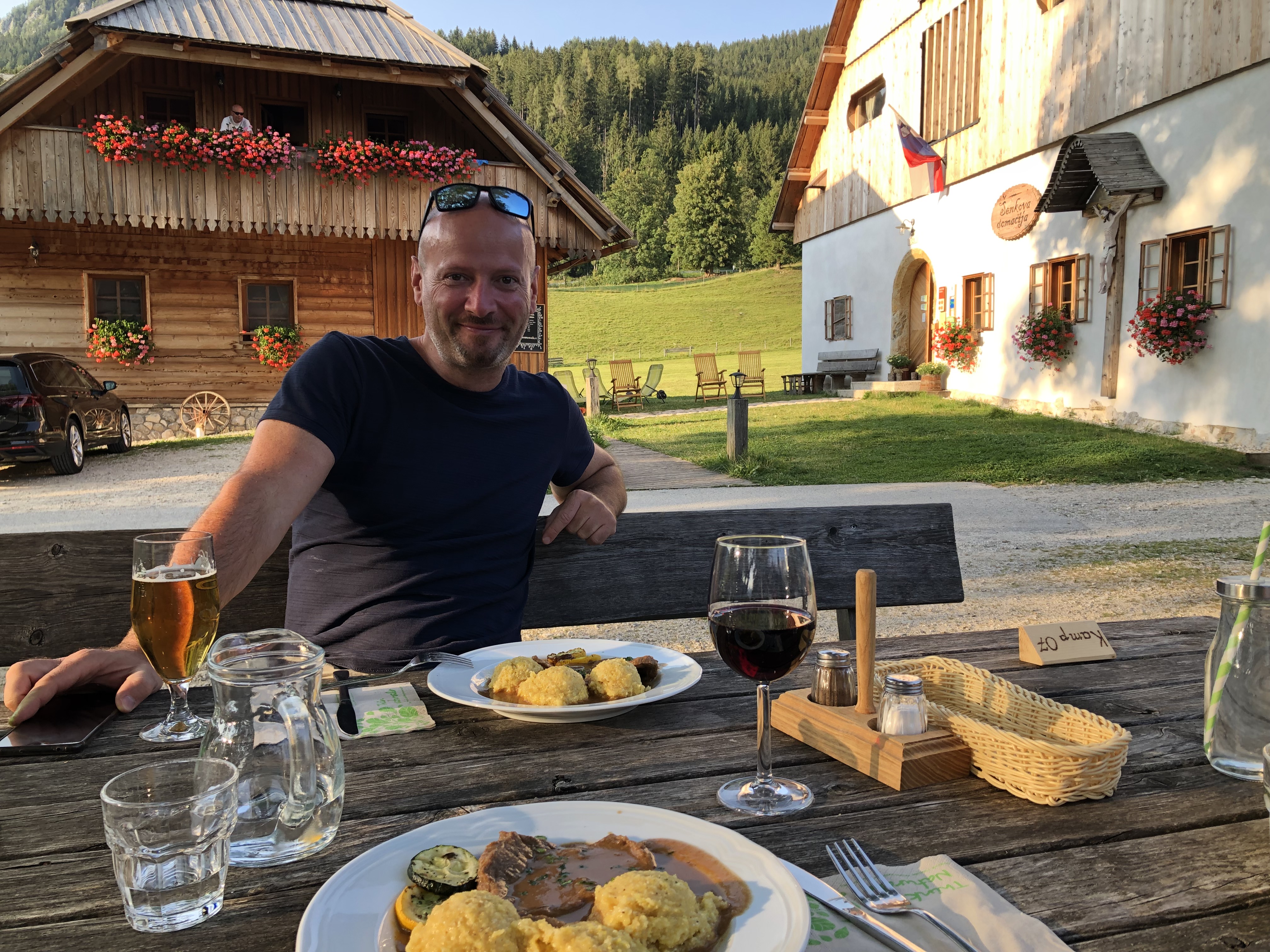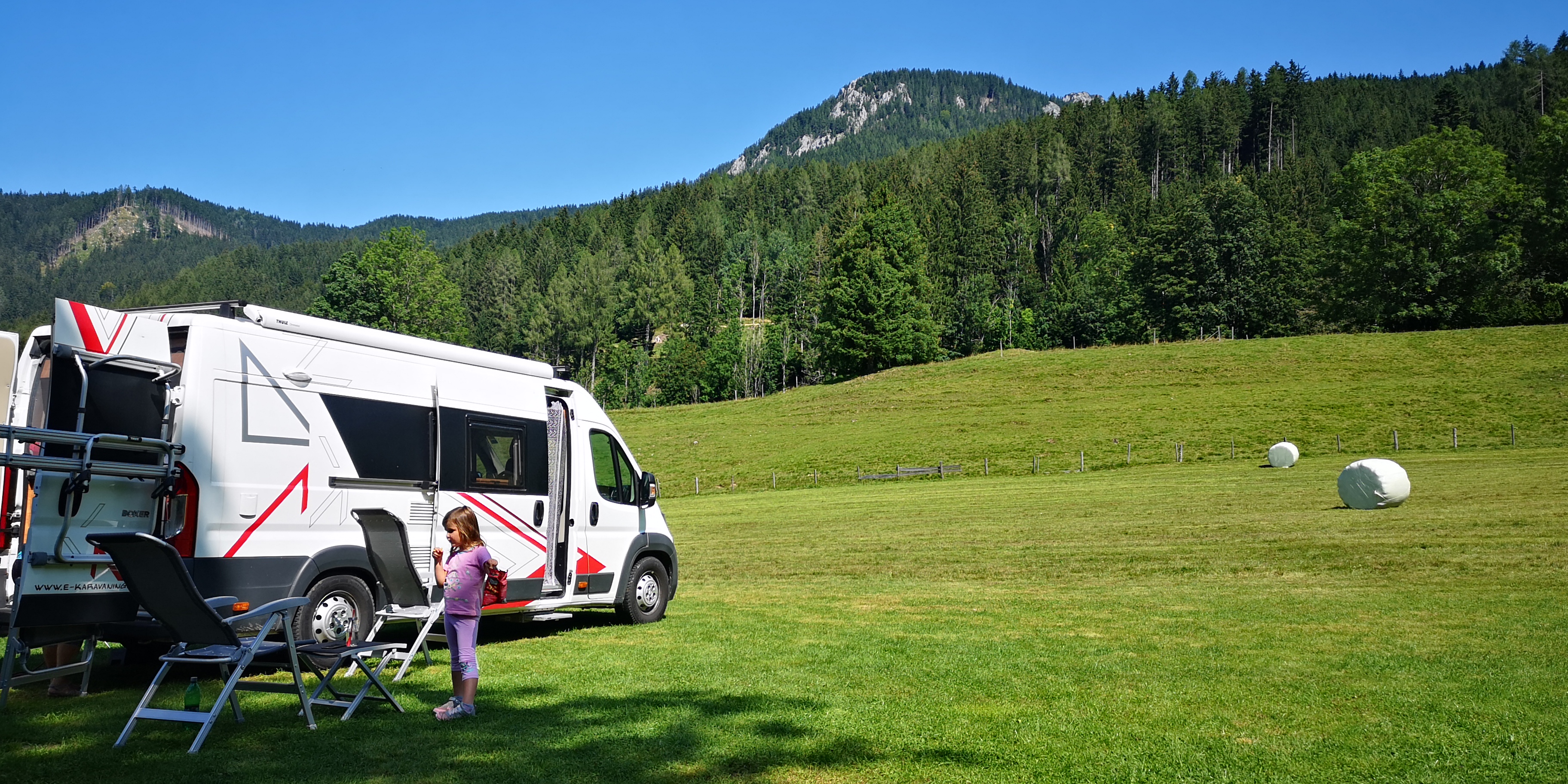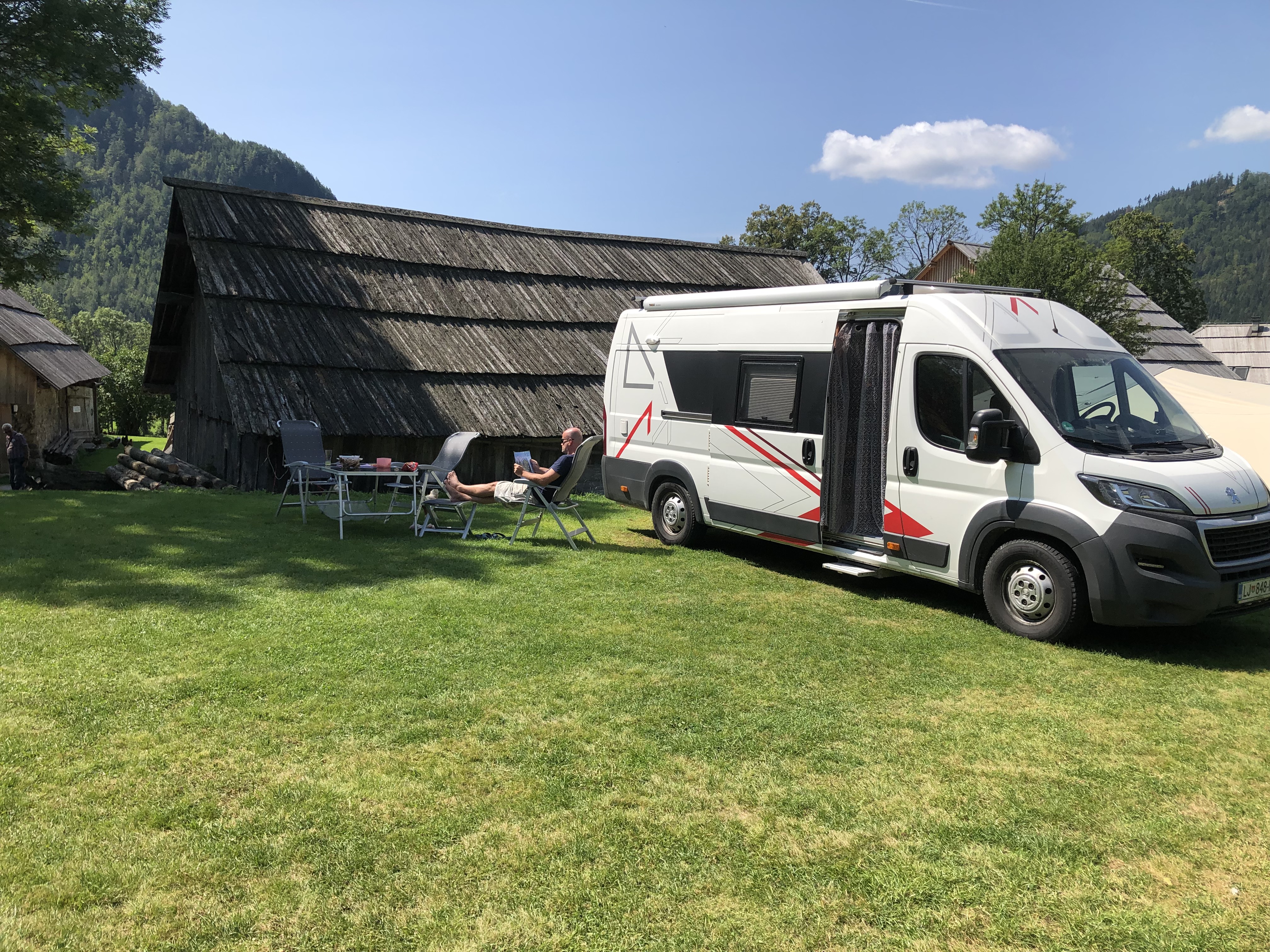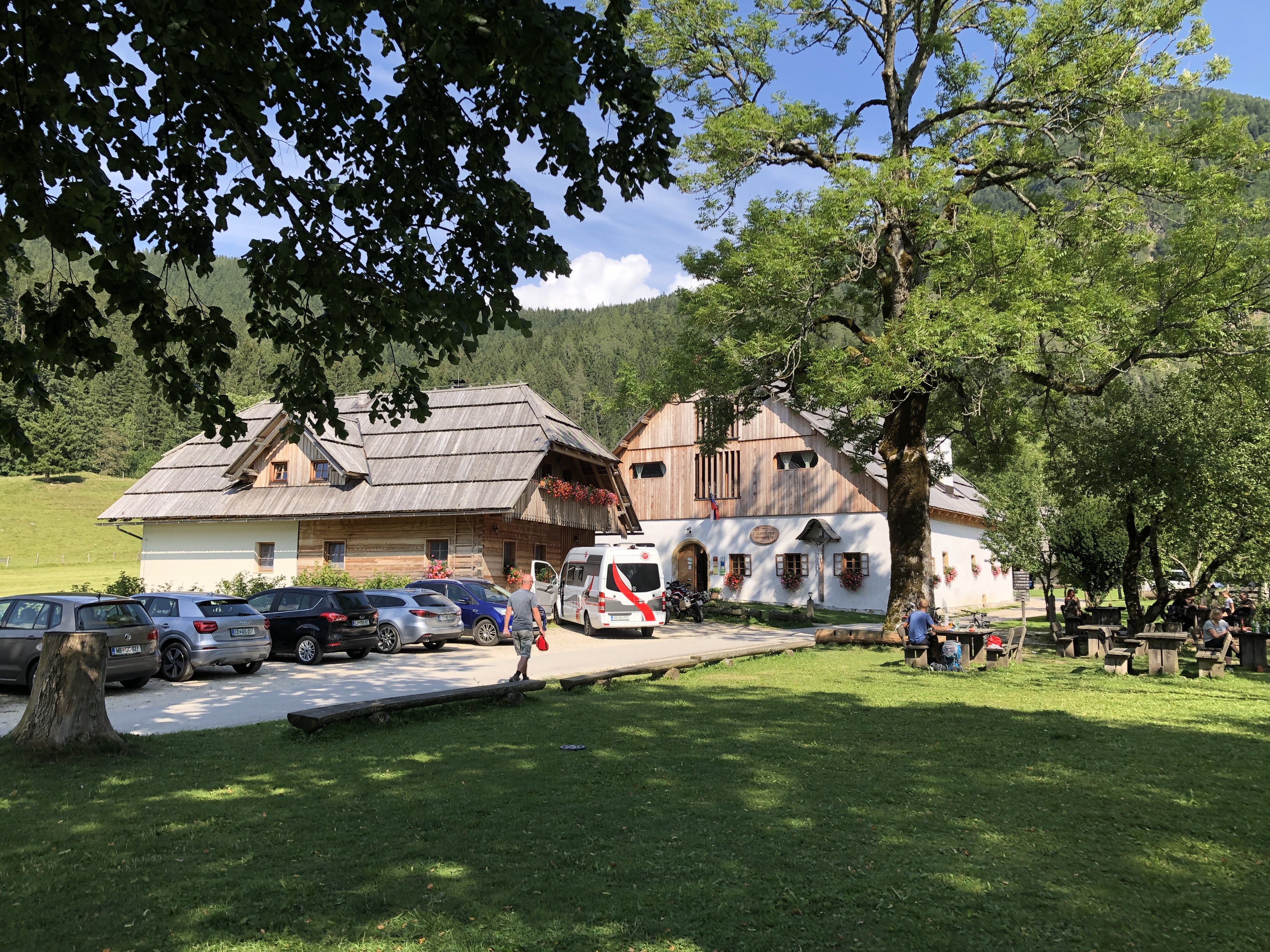 Štartali smo v soboto zjutraj in prišli pred vrata domačije okoli desete ure. Bil je eden tistih vikendov, ki se ga bodo zagotovo spominjali po množici turistov in izletnikov. Domačija je pokala po šivih, vse njihove kapacitete so bile popolnjene (imajo nekaj sob in apartmajev s skupno 28 ležišči). Ob domačiji so uredili nekaj postajališč za avtodome, kjer se lahko priklopite na elektriko in hkrati natočite vodo. Bližnji travnik pa je namenjen šotoristom oziroma tistim, ki želijo morda samo prespati noč. Tako se je tam znašlo kar nekaj kombijev in tudi avtomobilov, kjer so si obiskovalci uredili začasna domovanja in prenočišča. Bilo pa je tudi nekaj avtodomov, za katere se ni našel prostor na postajališču. In tudi mi smo parkirali tam, prav nič moteče, pravzaprav smo bili veseli, saj smo imeli bistveno več prostora na lepo pokošenem travniku, s krasnim razgledom na okoliške hribe.