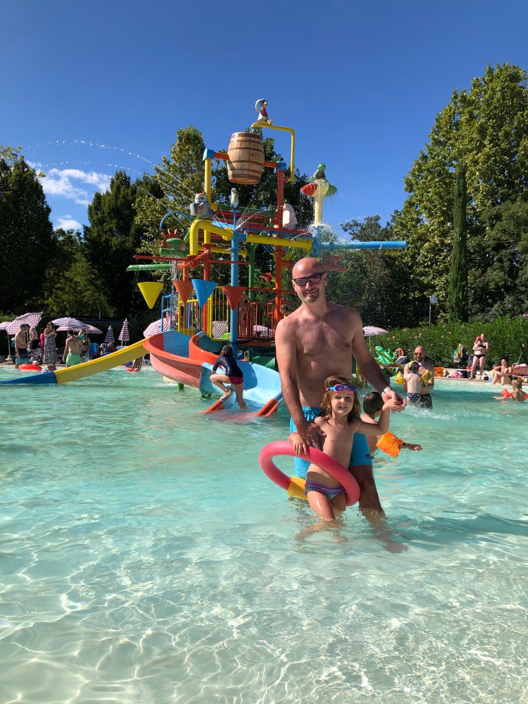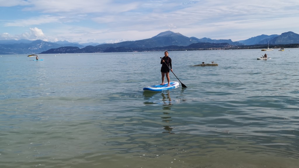 Naslednji trenutki minevajo v spoznavanju kampa, ki je res ogromen (več si lahko preberete v posebnem opisu kampa) in temu primerno je tudi veliko infrastrukture. Bazenski kompleks spominja na pravi vodni park z nešteto bazeni in igrali za otroke. Tam je tudi pravi mali amfiteater, kjer se čez dan in zvečer odvijajo plesne aktivnosti za otroke, zraven so tudi delavnice. Vse lepo in prav, vendar je zaradi velikosti kampa in njegove polne zasedenosti posledično tudi velika gneča – popoldne je praktično nemogoče dobiti prosti ležalnik ob bazenih, pa čeprav je le-teh na stotine. Je bila pa naša parcela le nekaj deset korakov stran od jezera, zato smo napihnili naš SUP in se dopoldne podali v jezero. To je bilo v času našega obiska dokaj umazano – poleg trave, ki pač raste na dnu, so se na površini jezera nabirale penice, ki prav gotovo ne pomenijo dobre novice za tiste, ki iščejo kristalno čisto vodo. S SUP-om pa nismo imeli težav in smo malce stran od obale vseeno našli primerno vodo za skok v jezero. Voda je bila dokaj nemirna za jezero, vendar smo sedaj ratali že pravi mački za obvladovanje našega ‘plovila’.