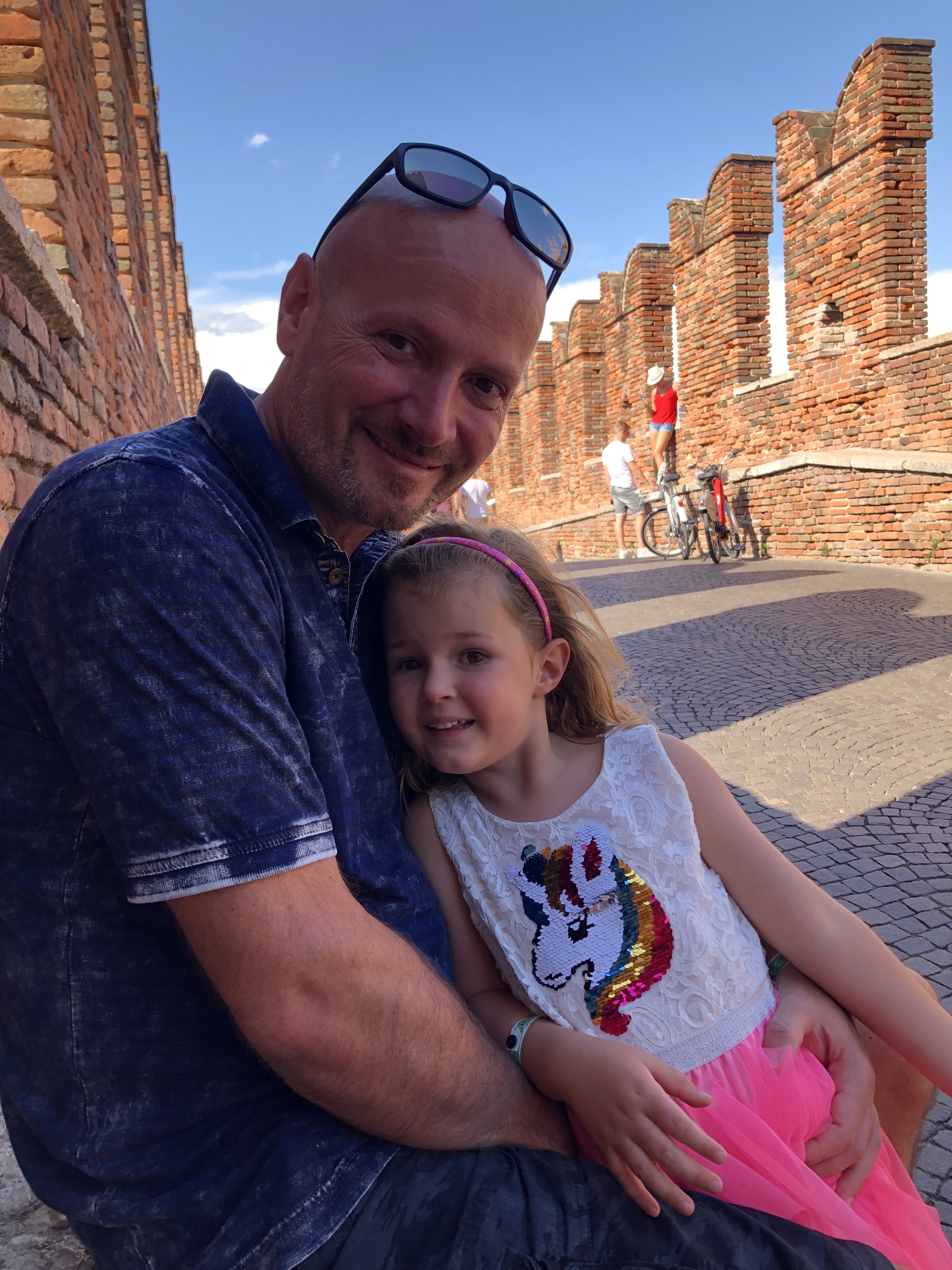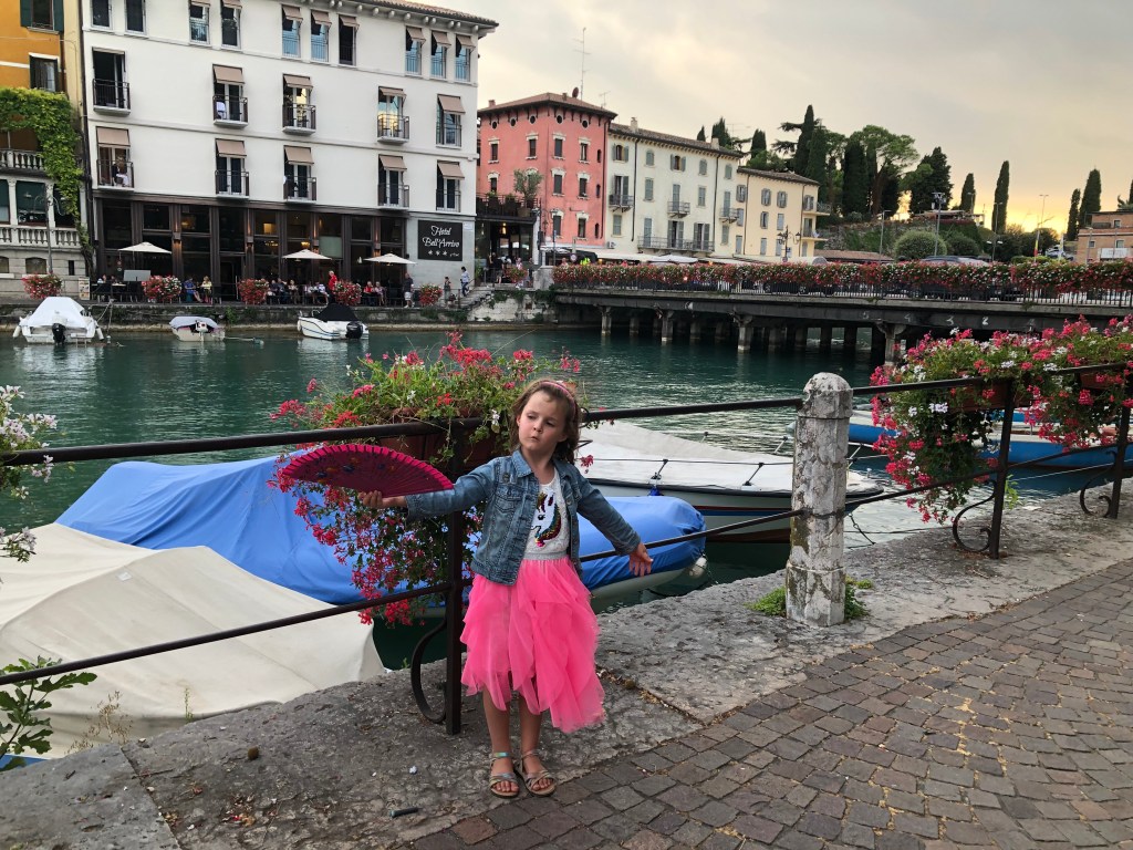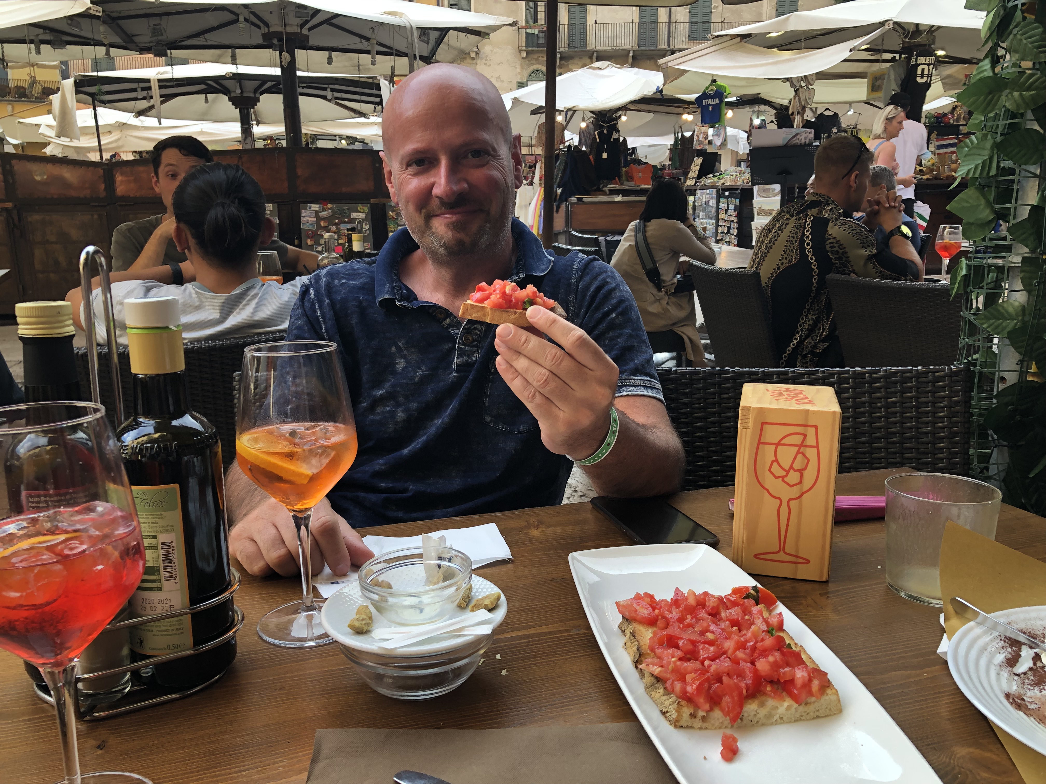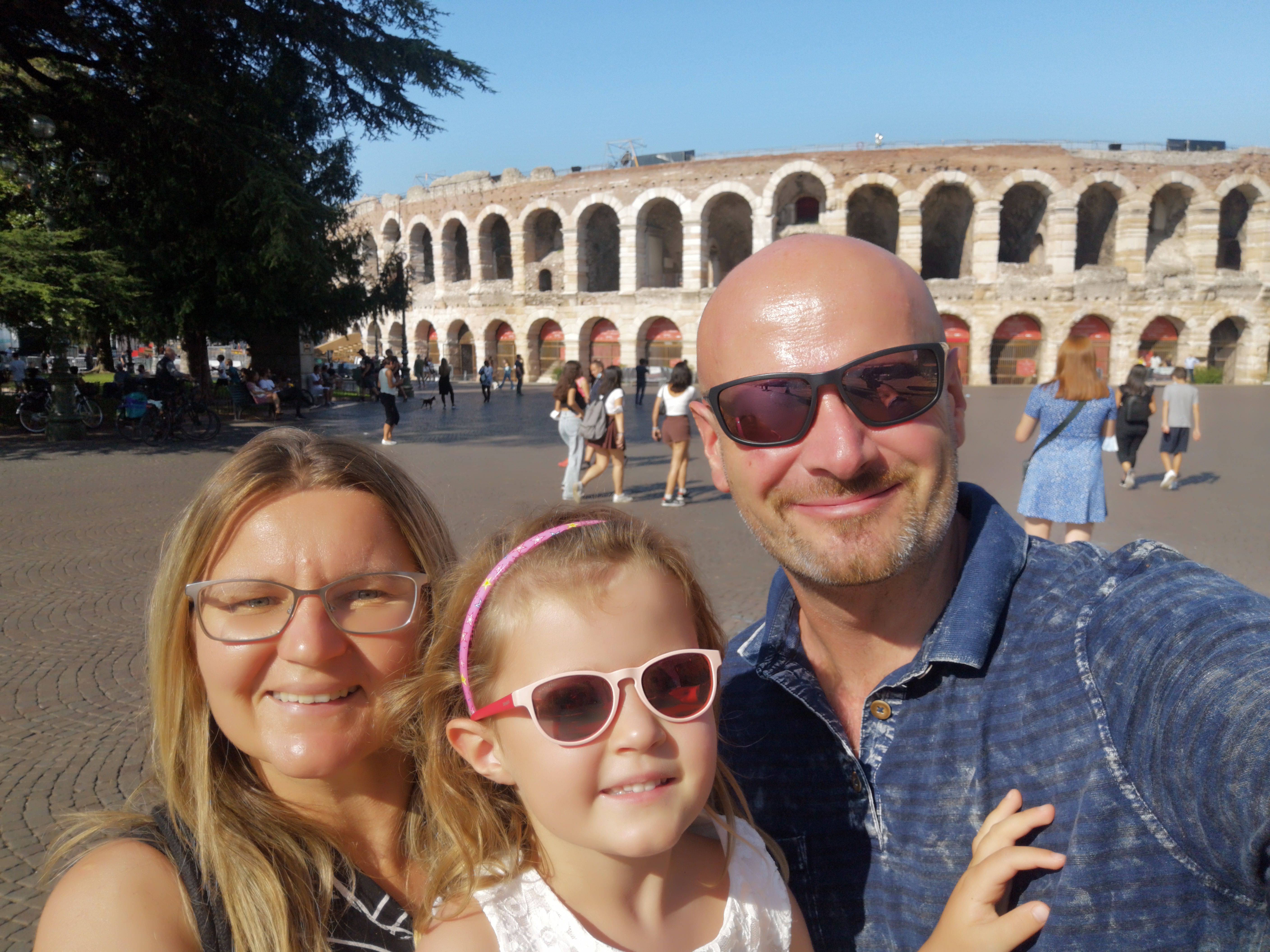 Naslednji dan je bil naš glavni cilj obisk Verone z vlakom, saj je Peschiera priročno povezana z mestom Romea in Julije. Železniška postaja se sicer nahaja v centru mesta, vendar je bila od našega kampa oddaljena približno pol ure hoda. Zato smo si vmes privoščili še kosilo v eni od restavracij ob kanalu. Nič gurmanskega, pico in testenine – oboje pa je bilo zelo korektno in italijansko okusno. Vlaki sicer vozijo dokaj pogosto, vendar tisti (regionalni vlaki), ki so cenovno ugodni, vozijo na približno eno uro. Direktna vožnja brez postaj je trajala 17 minut in nas je stala 18 eurov (povratna) za vse tri. V Verono smo prispeli v žgočem popoldanskem soncu, zato smo na poti s postaje proti centru iskali senco. Po približno 20 minut hoje pridemo do starega dela Verone s svojimi znamenitostmi. Ker sva s Sašo že večkrat obiskala Verono smo se tokrat omejili zgolj na najbolj pomembne, cilj pa je vsaj nama bil Piazza delle Erbe, kjer sva vedno uživala v kozarčku ali dveh Aperol Spritza in spremljajočih prigrizkih. Tudi tokrat nisva bila razočarana, saj tukaj, po mojem mnenju, naredijo najboljši Spritz, prav tako pa so natakarji res pravi profesionalci. Pa še merice so izdatne, kar se je precej poznalo Saši, ki je bila po kozarcu in pol precej v rožicah. Poleg prihajajoče nevihte je bil prav to razlog, da smo si za povratek nazaj omislili taxi, ki nas je pripeljal v parih minutah na železniško postajo.