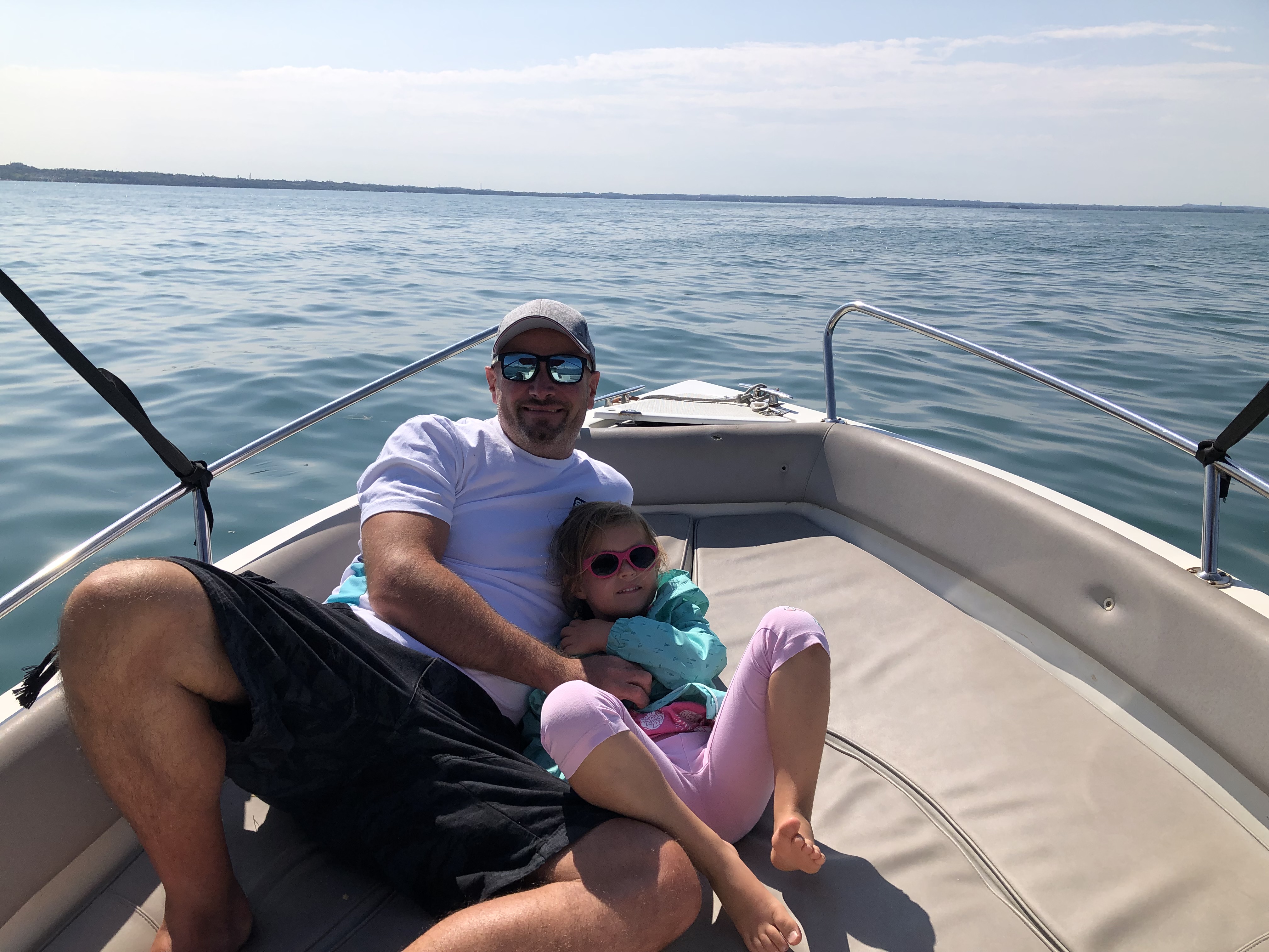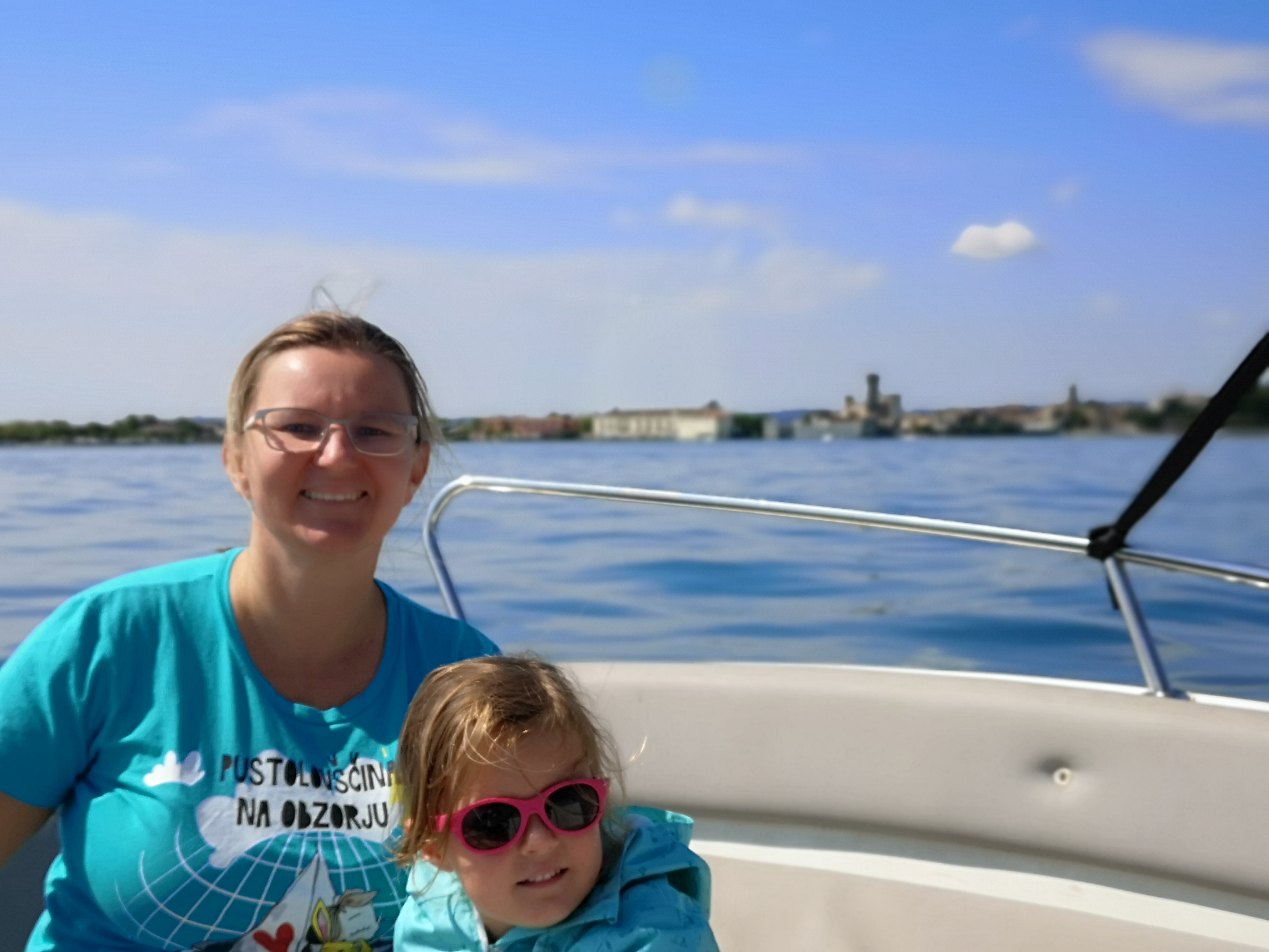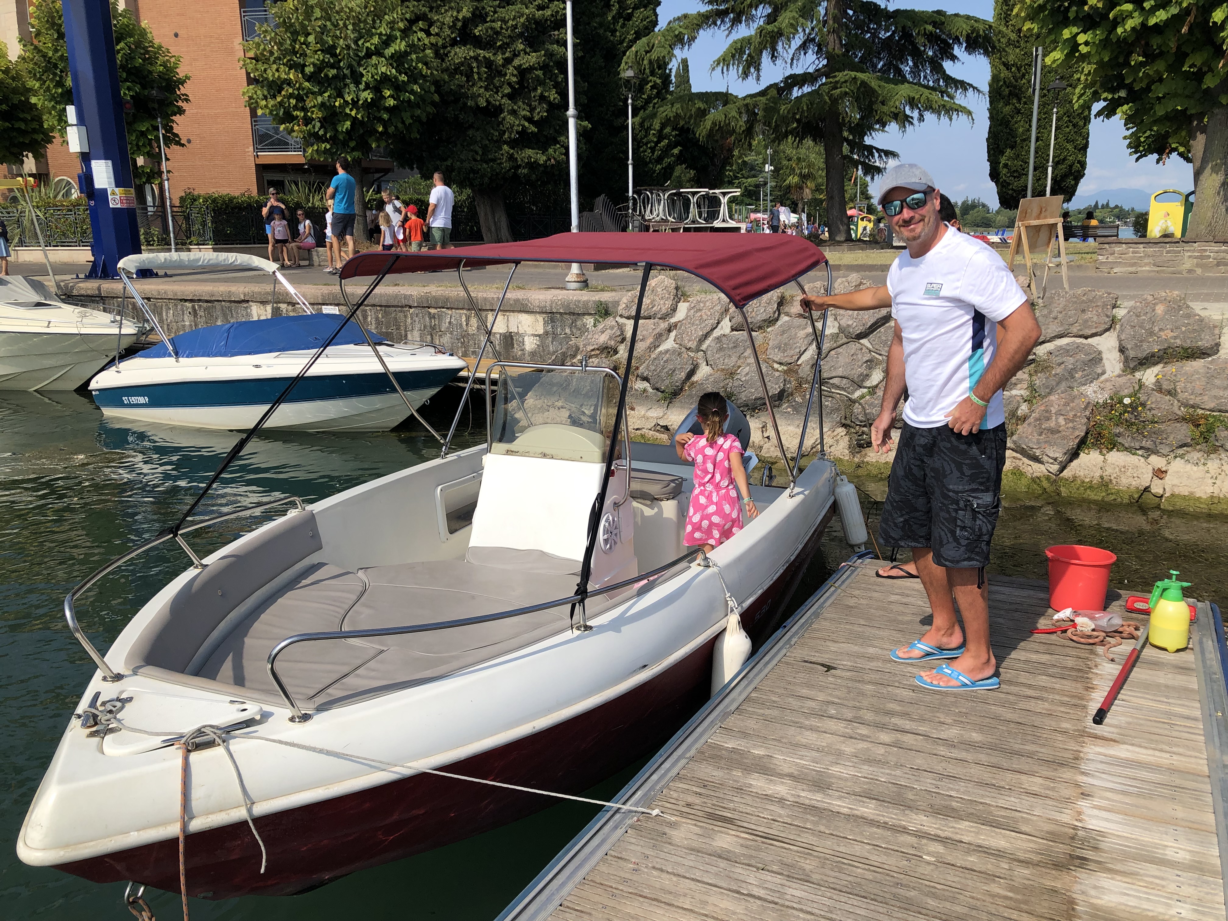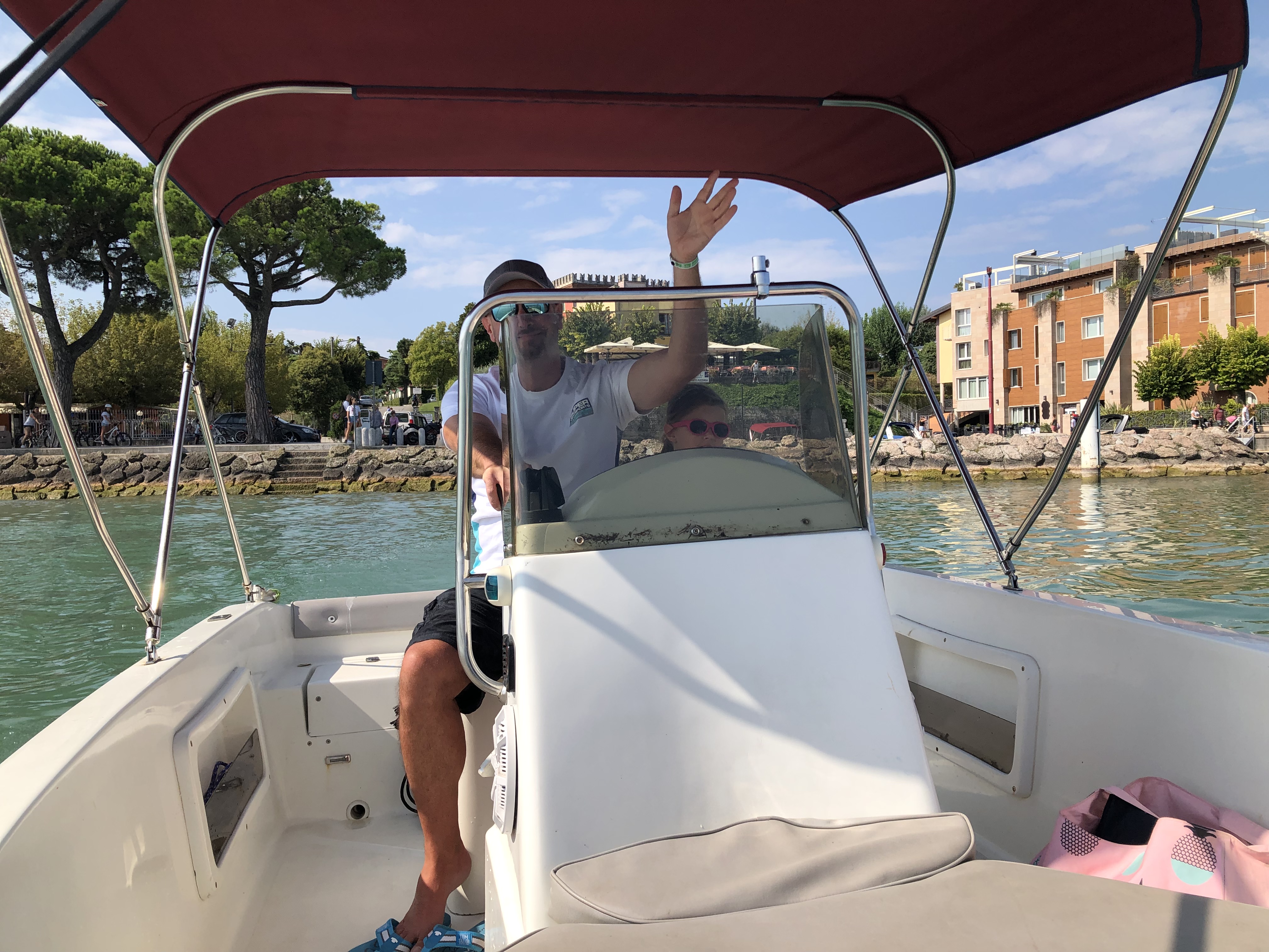 Še en dan na Gardskem jezeru se je začel z jasnim modrim nebom, ki je kar klical na novo pustolovščino. Za torek smo si rezervirali čoln pri eni od bližnjih lokalnih agencij, ki nudi prav spodobne čolne s 40 konjskimi močmi tudi za tiste, ki nimajo izpita za čoln. Po hitrem uvajanju o pravilih plovbe in osnovnih funkcij čolna, smo že šibali po jezeru proti Bardolinu in Gardi, kjer smo si privoščili kratek predah z malico na krovu čolna. Potem smo prečili jezero in se ustavili pred Sirmionejem, kjer domuje prekrasen grad. Žal se mu nismo mogli bolj približati, saj so bojda v njegovi bližini skale, ki bi lahko poškodovale propeler. Po dveh urah uživancije smo prispeli nazaj v naše ‘domače’ pristanišče.