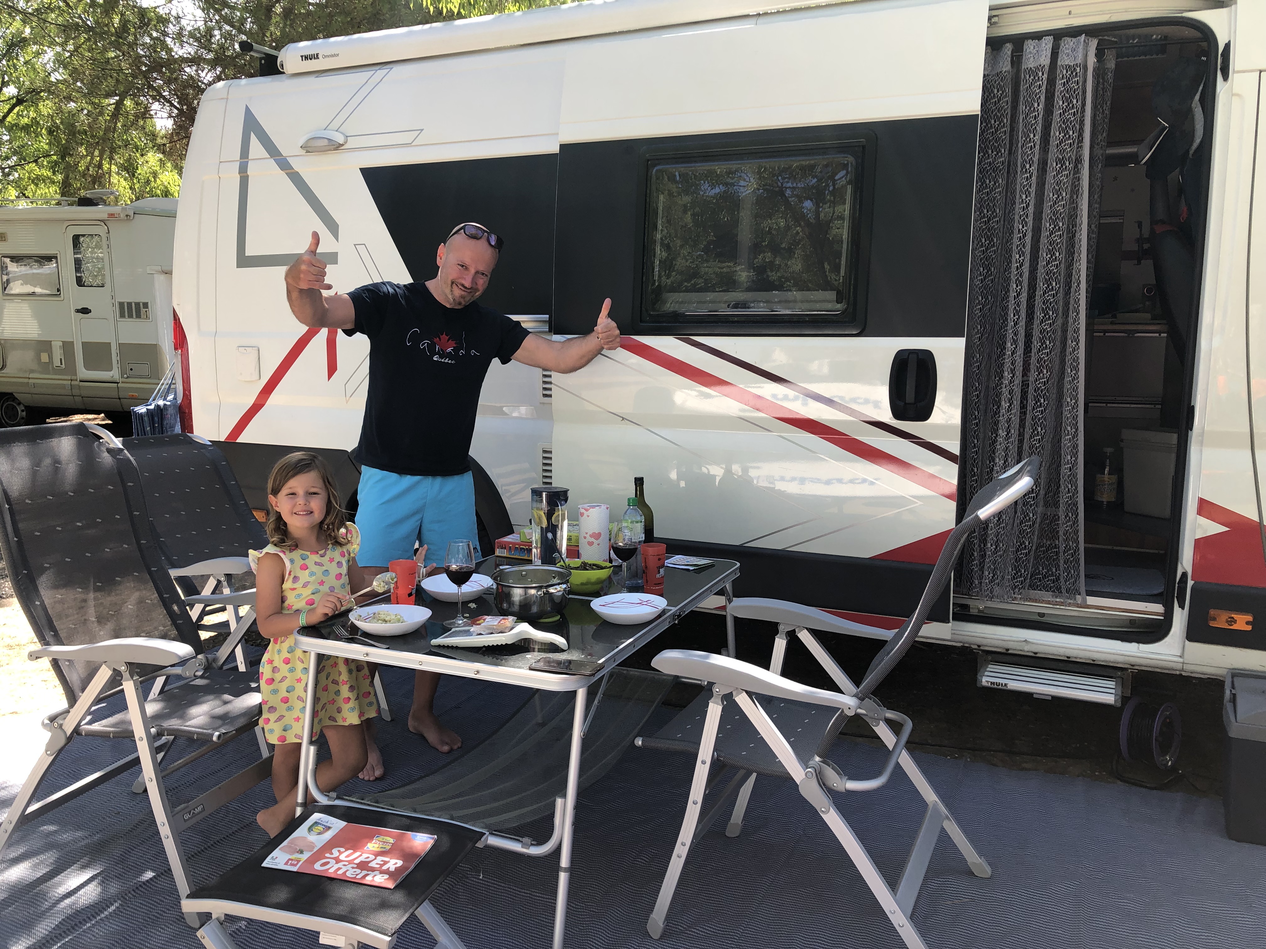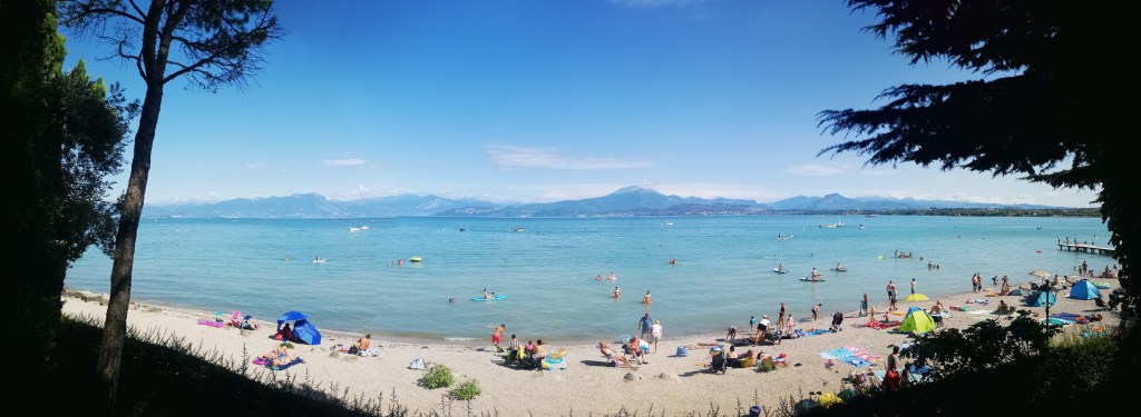 Formalnosti na recepciji smo opravili neverjetno hitro, čeprav je sprva kazalo, da se tam gnete kar veliko ljudi. Na rampi so nas vprašali po rezervaciji in še dobro, da smo rezervirali, sicer bi se obrisali pod nosom, saj je bil kamp nabito poln. Prijazni uslužbenci so nam hitro pobrali osebne izkaznice, v parih stavkih razložili osnovne stvari in že smo bili na misiji iskanje primerne parcele. Pravzaprav smo imeli kar srečo, da smo kmalu našli optimalno – malo sence, precej prostora in le lučaj od morja, pardon – jezera. Nekako se mi včasih še vedno zgodi tista začetniška, da ves zadovoljen odprem vrata avtodoma in občudujem kako lepo in optimalno sem ga parkiral, potem pa naslednji trenutek z grozo ugotovim, da so drsna vrata na tisto stran, kjer je grmovje. Aaaaaahhh, malo postojim sredi parcele, kjer bi se najraje udrl od sramu in se delam, kot da sem to z namenom izvedel, ker……no, ker sem se pač tako odločil. Ok, po tej mali nerodni nevšečnosti smo hitro našli svoj položaj in čez nekaj trenutkov smo že zadovoljno sedeli za mizo, kjer smo si privoščili rižoto. Seveda, smo v Italiji in na mizi bodo velikokrat italijanske specialitete. Verjetno bi pa tudi sicer bile, tudi, če bi bili nekje v Skandinaviji, saj se le-te lahko pripravijo hitro, okusno pa je kljub temu.