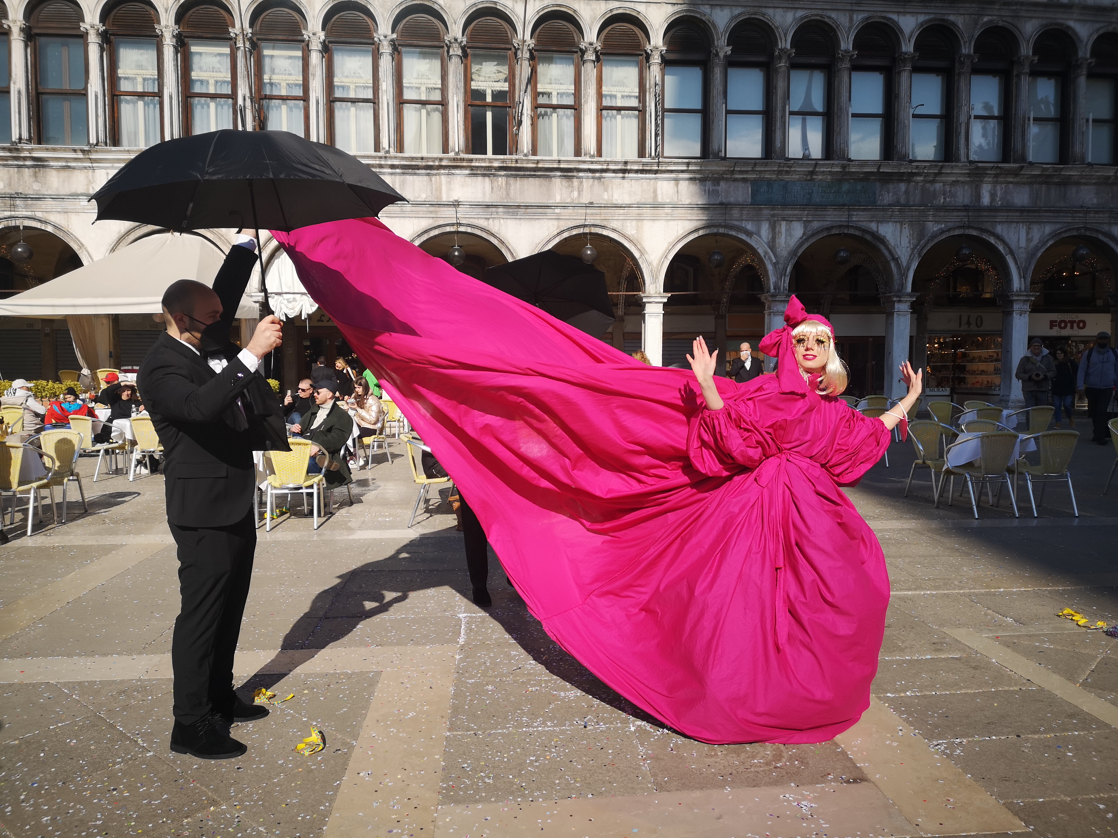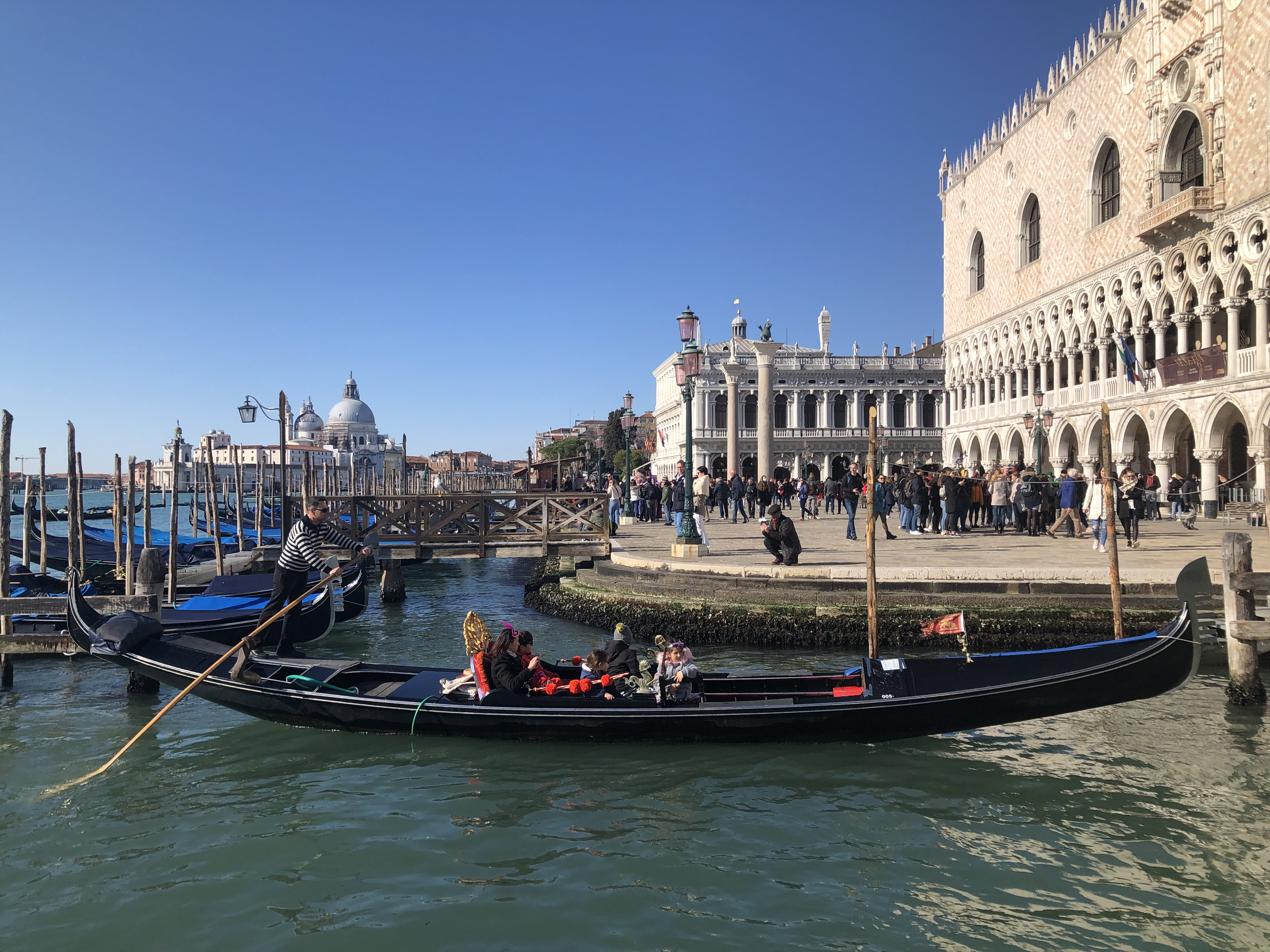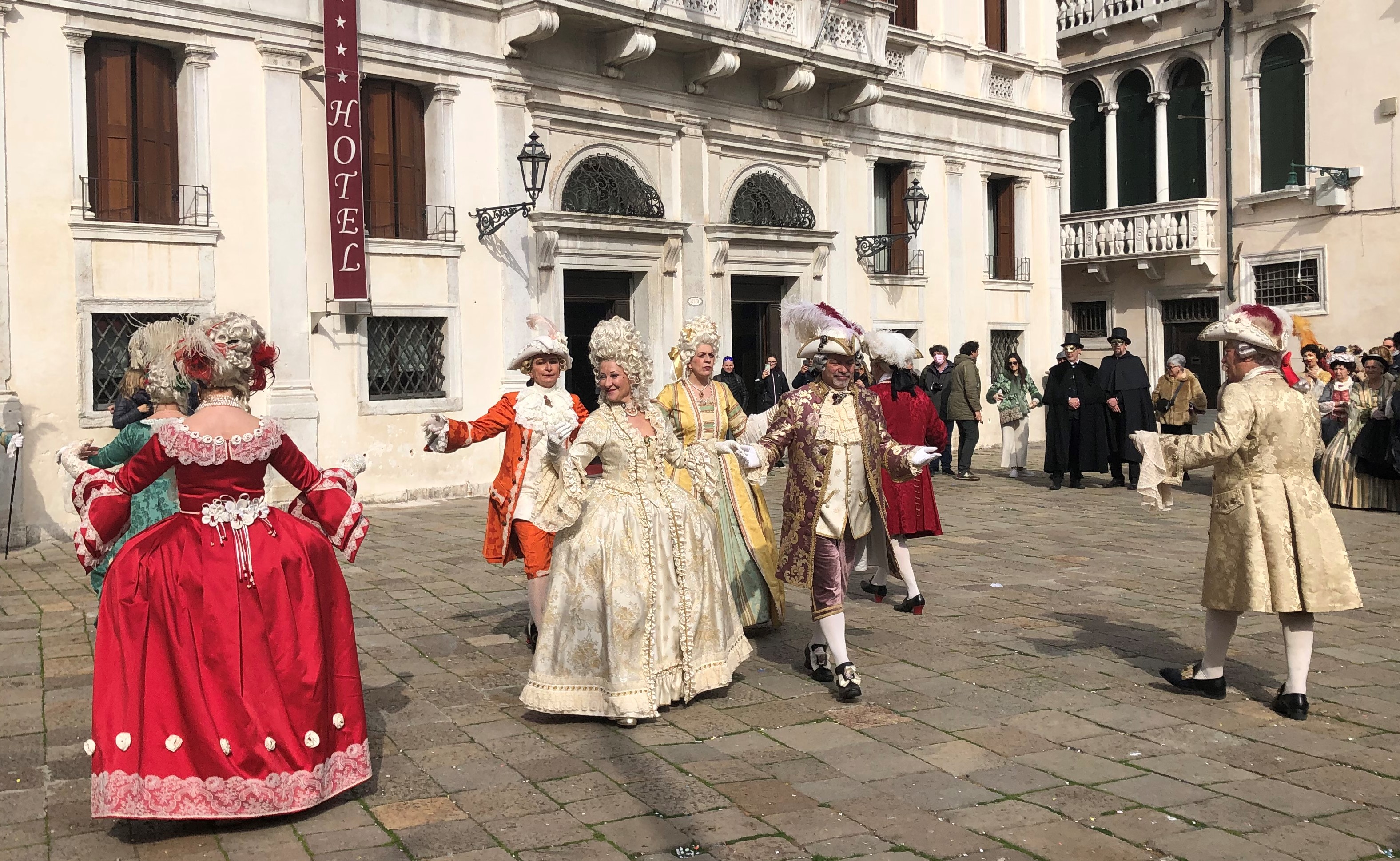 Vreme v soboto je bilo idealno za pustno rajanje, saj je bilo sončno in toplo, čeprav je bil še februar in je s severovzhoda že nekaj dni z močnim vetrom prihajal hladen znak. Na našo srečo o vetru ni bilo sledu, zato tudi nismo pretiravali s številom slojev oblačil pod našimi pustnimi kostumi. Naš pustni sprehod smo pričeli pred Doževo palačo, kjer se je nabralo že kar nekaj pravih beneških mask, še več pa je bilo radovednežev, ki so svojimi telefoni želeli ovekovečiti ta res poseben karnevalski utrip. Vseeno pa ni bilo pretirane gneče, zato si se lahko brez večjih težav gibal po najbolj obljudenih točkah, brez ovir smo lahko poslikali najbolj zanimive maske z našo Lauro ali brez, ogledali smo si tudi nekaj predstav na trgu Santa Maria Formosa, kjer so beneške maske plesale po pravcati srednjeveški koreografiji, postavljen pa je bil tudi manjši prireditveni prostor v obliki cirkusa, kjer smo lahko prisostvovali otroški predstavi italijanske akrobatske družine, ki je predstavljala ruski cirkus. Glede na to, da se je ravno pred par dnevi zgodila ruska agresija na Ukrajino, je bilo med množico čutiti rahlo nelagodje ob zvokih Kalinke in določenemu ruskemu besedišču. Bili pa so kar zabavni, zato smo jih na koncu nagradili z bučnim aplavzom. Še ena zadeva, ki smo jo sicer opazili že lansko leto – cene so po mojem mnenju še vedno zmerne, še posebej, če se za par ulic oddaljite od trga San Marka. Dan smo zaključili stran od turističnega vrveža in sicer v Cavallinu Treporte na stari dobi pici v eni izmed restavracij na poti.