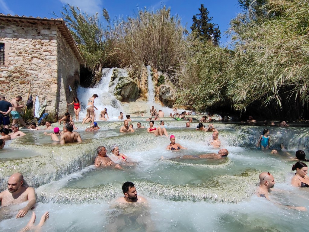 Plačali smo 18 eur in se po zajtrku odpravili na pot, najprej mimo Firenc in Siene, potem pa je pot postala bolj naporna, saj smo zapustili avtocesto, ki je bila tudi v precej slabem stanju (veliko lukenj, na vsakih nekaj kilometrov dela na cesti,…). Naš osrednji sobotni cilj je bila Saturnia oziroma najslavnejše italijanske terme na prostem – Cascate del Mulino. Naj takoj povem, da ima pot od Siene do Saturnie nešteto ovinkov, vzponov in prelazov, ki se jih ne bi sramovali niti v Alpah (čeravno ne gre tako visoko). Na voljo imate v bistvu dve varianti, ena gre bolj proti zahodni obali mimo Grosetta, drugo pa smo izbrali mi. Težko rečem, katera je slabša (ali boljša) ampak smo na koncu poti imeli občutek, da smo izbrali slabšo varianto. Kakorkoli, po napornih dobrih dveh urah vožnje od Siene oziroma štirih od PZA pri Sasso Marconiju smo končno prispeli do raja. Ampak tukaj pa novi šok – sicer prostorno parkirišče za obiskovalce teh neverjetnih kaskadnih bazenčkov, je bilo nabito polno, poleg tega pa niti ni namenjeno avtodomom (višinska ovira). Avtodomi morajo parkirati v prav posebnem kampu/parkirišču, ki je od same znamenitosti oddaljen približno 20 minut hoda. V kampu lahko parkirate (do 4h 8 EUR) ali prenočite (24h 16 EUR), nudijo vam elektriko, vodo in wc-je, tuši pa so na voljo za doplačilo (1 EUR nekaj minut). Mi smo izkoristili predvsem zato, da smo si skuhali špagete in po kopanju v bazenčkih dobro stuširali, saj ima voda v njih tipičen mineralni vonj, vendar vseeno ne tako izrazit. So pa ti termalni bazenčki prava paša za oči in telo – voda v njih ima približno 37 stopinj, tla v bazenih pa so večinoma apnenčasta in tudi nasuta s kamenčki za lažjo hojo. V poletni vročini se tukaj ne moreš ohladiti, v drugih letnih časih pa te naravne terme prav gotovo predstavljajo prijetno in zaradi gneče, relativno sproščujočo izkušnjo.