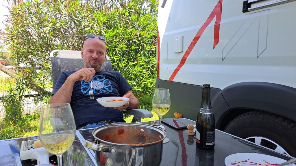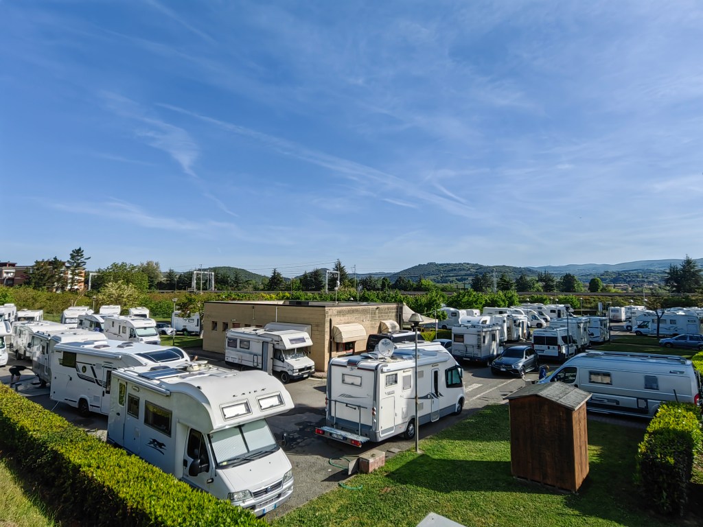 Ker nam je uspelo uiti pred petkovo popoldansko prometno konico v Ljubljani, smo kar hitro požirali avtocestne kilometre in še preden se je končalo glasovanje za naj popevko tedna na Val 202, smo že prebirali italijanske cestne oznake, ki so nas najprej usmerjali proti Benetkam in kasneje proti Padovi, kjer smo se preusmerili na avtocestni odsek proti Bologni. Cilj nam je bil, da prevozimo čim več kilometrov, da nam bo ostalo v nadaljevanju čim manj poti do Rima. Kot vedno, smo preko aplikacije Park4night poiskali primerno parkirišče za prenočitev v okolici Bologne, pravzaprav smo ga našli kakšnih 30 km južneje v kraju Sasso Marconi, do katerega pa smo prišli težje od pričakovanega. Namreč, v času našega potovanja so potekala obsežna dela na avtocesti, predvsem v Bologni in južneje (A1 proti Firencam), zato so bili marsikateri izvozi zaprti. Da je bila mera polna je bil izbrani izvoz z avtoceste možen le z italijanskim avtomatskim sistemom cestninjenja, brez možnosti plačila s karticami ali gotovino. Zato smo naredili kar konkreten obvoz, vendar na koncu vseeno prišli do PZA-ja, ki smo ga izbrali za našo prvo noč na poti. Najprej smo se spogledovali tudi z brezplačnim parkiriščem ob krajevnem pokopališču, kjer je na voljo veliko prostora, nasproti asfaltiranega dela pa je tudi velik travnik, kjer je bilo parkiranih kar nekaj avtodomov. Vseeno pa smo želeli zaradi oskrbe z vodo priti na urejeno PZA parkirišče (Air de Camping-car), ki je bilo oddaljeno samo še kakšen kilometer naprej. Gre sicer za manjšo zadevo, kjer je prostora za 12 avtodomov, vendar v lepem naravnem okolju (travnate površine obdane z gozdom). Recepcija, kjer dobite daljinca za rampo se nahaja v hotelu Ca’Vecchia nedaleč stran, kjer boste našli tudi wc-je in tudi restavracijo z bojda zelo okusnimi jedmi – na žalost jih nismo uspeli preveriti.