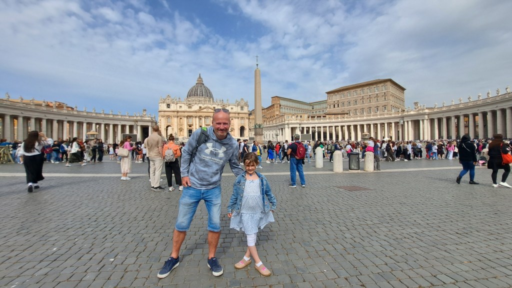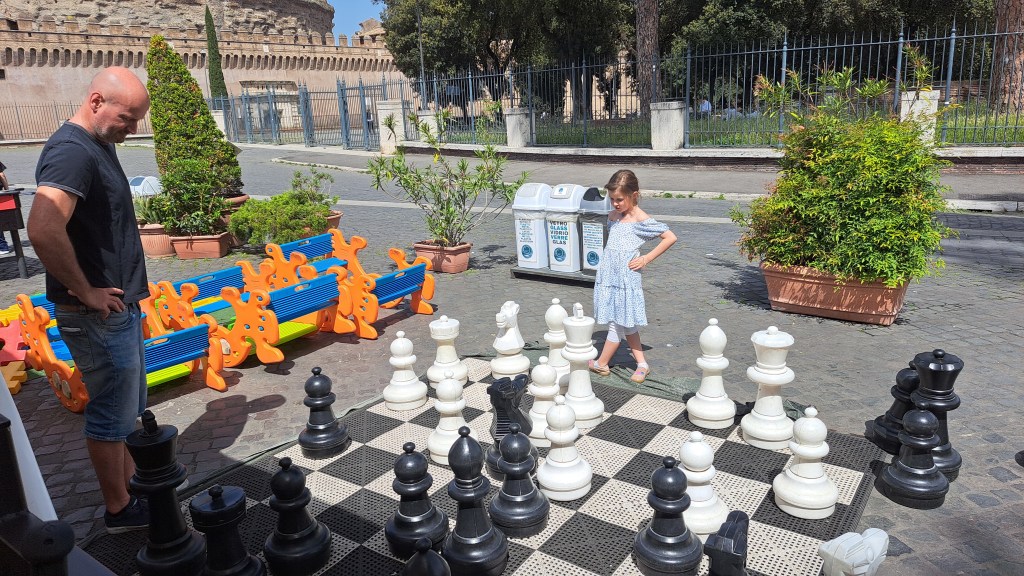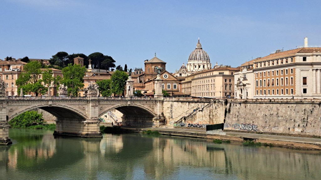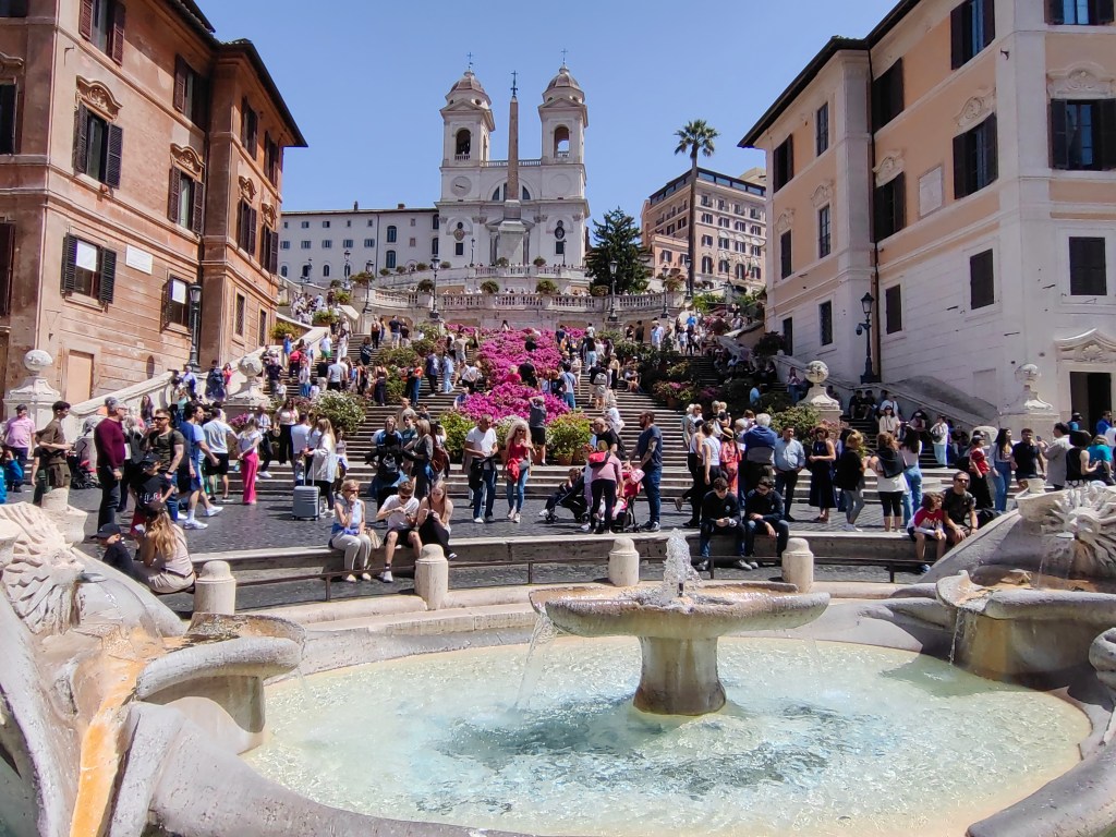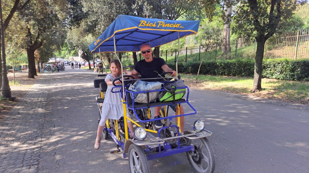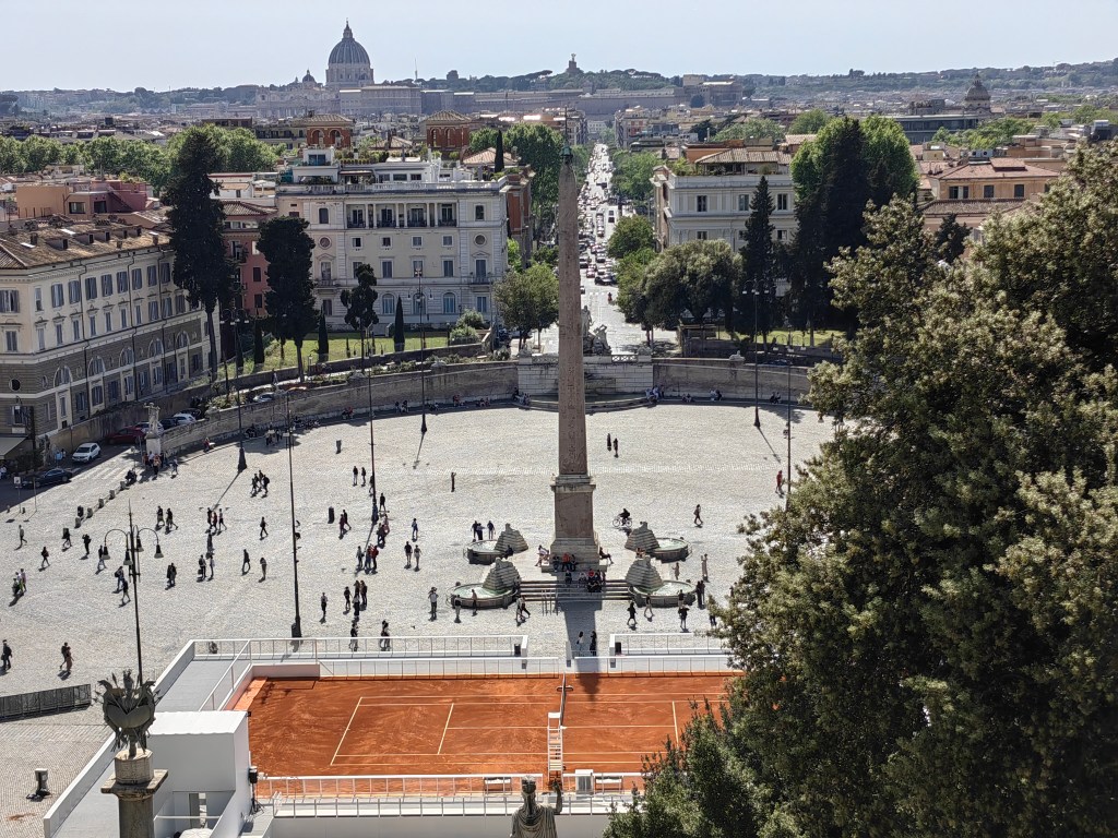 Zbudili smo se v oblačno jutro, pred nami pa je bil še en naporen dan, saj smo načrtovali zopet preko 20k korakov. Začeli smo že ob 8.30 uri na Petrovem trgu, kjer pa je že množica ljudi čakala v vrsti za vstop v največjo krščansko baziliko na svetu. Resnično, nismo pričakovali, da bo vrsta ljudi tako zgodaj že tako dolga, ampak nam ni drugega preostalo, kot da se postavimo na njeno začelje in potrpežljivo, nekako v romarskem duhu čakamo, da bomo na vrsti za vstop. Ob čakanju smo naredili na desetine posnetkov bazilike Svetega Petra in trga pred njo, po približno 25 minutah (na koncu ni bilo tako hudo) pa so nas po varnostnem pregledu spustili v cerkev, ki je znotraj resnično dih jemajoča, še boljši pa je razgled z vrha, ki pa je bil za nas tokrat nedosegljiv, zopet zaradi vrste čakajočih. V okviru Vatikana je verjetno glavna atrakcija Sikstinska kapela z Michelangelovimi freskami ter Vatikanski muzeji. Le do slednjih bi lahko kupili vstopnice, za Sikstinsko kapelo pa so bile vstopnice razprodane že nekaj tednov prej. Če res načrtujete obisk Rima za prvomajske praznike, je res potrebno vstopnice za najpomembnejše atrakcije (predvsem kapelo) rezervirati verjetno vsaj mesec ali dva vnaprej. Nič ne de – več časa nam je ostalo za obisk še nekaterih, ogleda vrednih rimskih turističnih znamenitosti. Zopet smo uporabili naše pohodniške noge in se peš odpravili iz Vatikana do mosta Ponte Sant’Angelo in istoimenskega gradu ob reki Tiberi. Od gradu proti severni strani smo ob reki našli simpatičen lokalček Biblio Bar Roma, kjer strežejo krasne rogljičke, panine in seveda vrhunsko kavo. Lahko si tudi sposodite kakšno knjigo ali odigrate šah z velikimi plastičnimi figuricami. Od tam pa do Piazza de Spagna ni več daleč, zato so bile znamenite španske stopnice naš naslednji cilj, kjer se je zopet trlo ljudi, vendar se je nekako dalo ujeti par dobrih fotografij. Po odličnem kosilu v bližini smo skočili še do vodnjaka Trevi, ki pa je na našo veliko žalost bil ograjen zaradi nam neznanega razloga – v njegovo neposredno bližino, da bi lahko zalučal kak kovanec čez ramo nismo smeli. Zaradi vročine, bilo je preko 30 stopinj, smo si preostanek popoldneva želeli preživeti v senci dreves, zato smo se odpravili v prekrasni park Villa Borghese in ga obdelali po dolgem in počez v najetem štirisedu na nožni in delno električni pogon, kar nas je precej zabavalo. Z vrha parka se lepo ujame tudi Piazza del Popolo, kjer so v času našega obiska postavili pravo teniško igrišče, saj je moška teniška karavana čez nekaj dni prišla v večno mesto na enega od največjih spomladanskih ATP turnirjev.