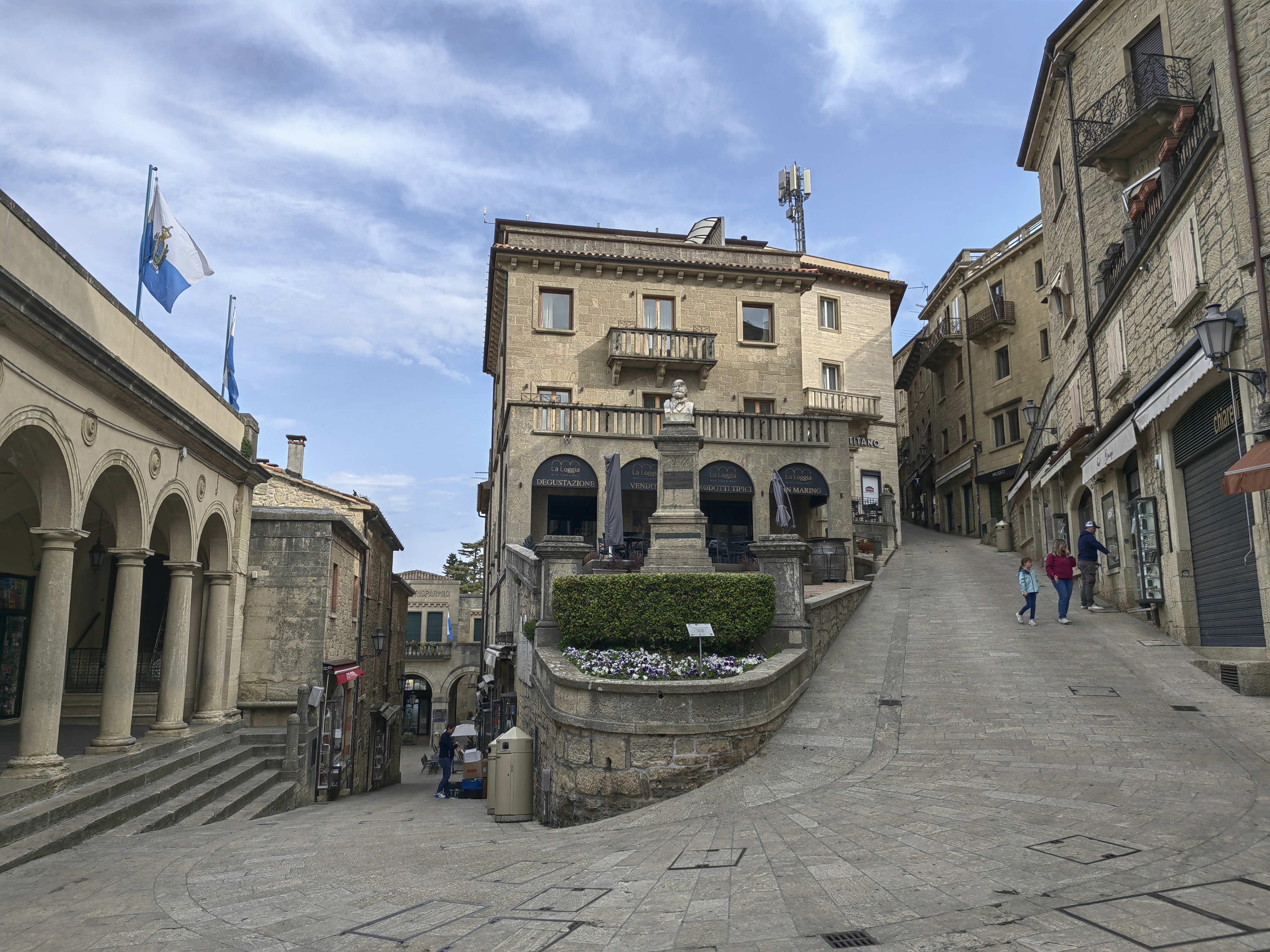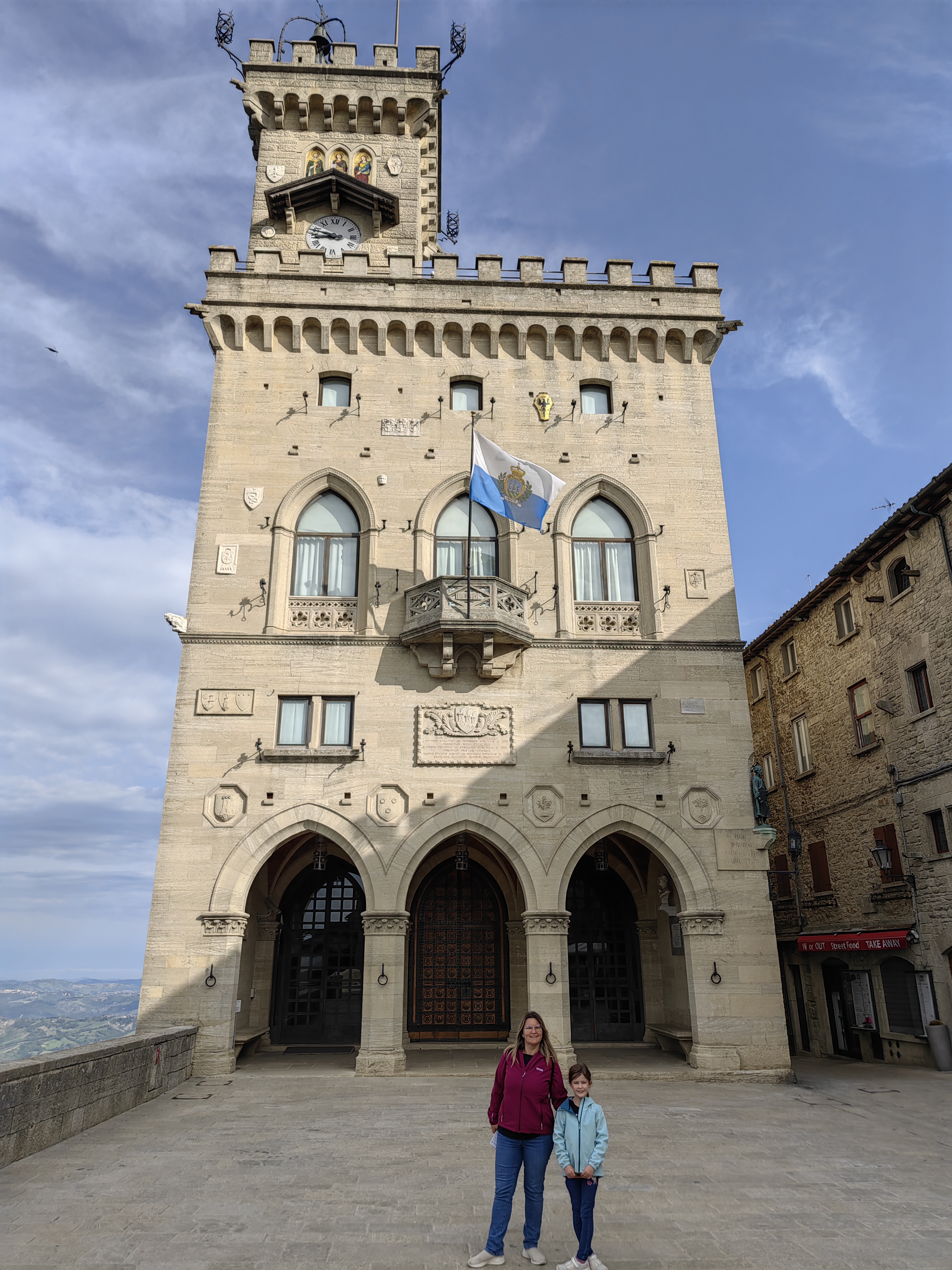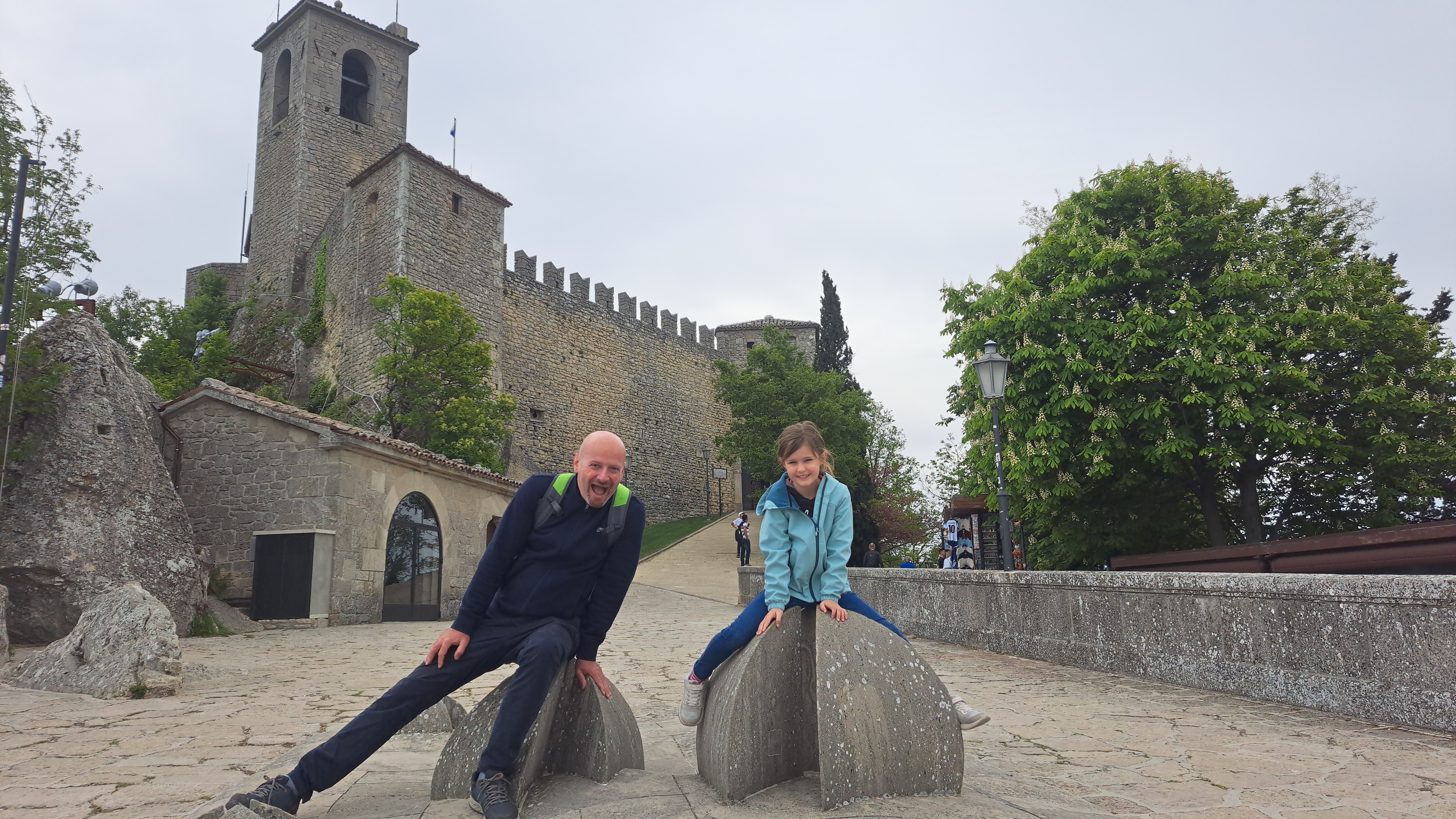 Po krasno prespani noči, kjer se je temperatura kar prijetno spustila v primerjavi z Rimom, smo bili ob devetih zjutraj že na vzpenjači, ki te popelje v stari, ograjeni del mesta San Marino na vrh hriba. Ko smo prišli gor, skoraj ni bilo žive duše, saj se večina trgovinic in lokalov odpira ob 10.uri. Malo smo se sprehodili in naredili nekaj fotk, potem pa sta naši dve napadli trgovinice. Izbira je dokaj enolična, v veliki večini pa prevladuje nakit, hrana in pijača, oblačila in nekaj iz področja raznih gadgetov za mobilne naprave. Aja, in ogromno nekega orožja, predvidevam, da namenjenega lovu. In še nekaj – ne iščite kakšnih znanih blagovnih znamk, morda se kvečjemu najdejo pri obutvi, ostalo pa so bolj ali manj meni neznane firme (lokalnega izvora?). Hrana in pijača sta na zmerni cenovni ravni, izdelki pa nič posebnega. Sprehod po San Marinu pa je vseeno prijetno doživetje, saj so ulice slikovite in urejene, razgledi nad pokrajino pa so dih jemajoči. Kasneje po 10. uri se tudi prijetno napolnijo. Vsekakor za videti, večkrat pa verjetno ne. Aja, gorivo je tudi cenejše kot v ‘sosednji’ Italiji. Tja nazaj smo se podali v smeri Riminija, in se ustavili najprej pred neko miniaturno različico Mirabilandije, kjer smo želeli preživeti popoldne, saj je vreme grozilo z dežjem. Vstop v park ni bil niti poceni, ko pa so nam želeli računati še 10 eur za parking, smo se jim hitro zahvalili. Ni nam preostalo nič drugega, kot da najdemo neko parkirišče za prespat in organiziramo popoldanske družinske igre v avtodomu. Smo potrebovali kar nekaj časa, da smo našli primeren kamp, saj so bili mnogi še zaprti, drugi pa so bili na čudnih lokacijah. Na koncu smo ga našli južno od Ravenne, en res simpatičen Camping Bio Farm (44.389409, 12.246296), kjer so bile lepe, travnate parcele, imeli so celo bazen, vendar ga žal zaradi slabega vremena nismo uspeli izkoristiti, ponujali so tudi večerjo in pa lokalno vino po ugodnih cenah. Kamp se nahaja tudi v bližini Mirabilandije, ki smo si jo nekako zamislili za dan kasneje, če se nas bo vreme usmililo.