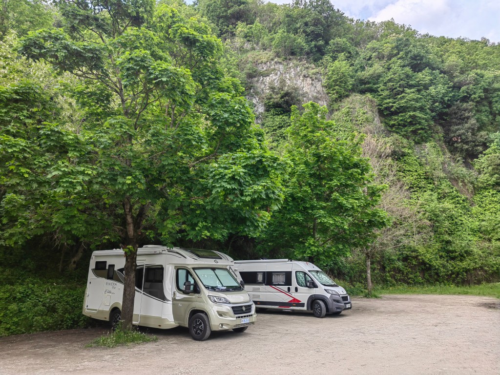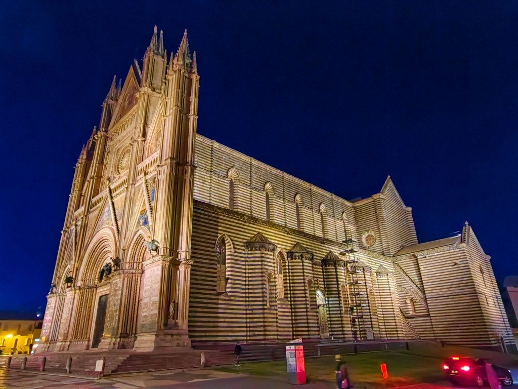 Naša zadnja postaja tega dne je bilo simpatično srednjeveško mesto Orvieto, čigar stari del se nahaja na vrhu vzpetine – kar nekaj podobno ležečih mest smo še videli na naši poti in prav gotovo vsa imajo nek zgodovinski šarm, predvsem pa ponujajo lepe razglede na pokrajino. Zopet smo morali prevoziti nešteto ovinkov in klancev, da smo na koncu že proti večeru prišli do parkirišča za avtodome (Area sosta Battistelli Renzo, N 42.725310, E 12.126630), ki se priročno nahaja tik ob vznožju hriba, le kakšnih 100 metrov od postaje vzpenjače. Zraven se tudi nahaja avtobusna postaja (tudi z avtobusom pridete gor) in pa večje parkirišče za avtomobile. Žal je bilo parkirišče polno zasedeno, pravzaprav so uporabili še dodatno luknjo, da so spravili še kakšno sorodno popotniško dušo z avtodomom, ki je bil za to pripravljen plačati 20 eur za 24h. Šef parkirišča nas je potem usmeril na bližnje, bolj provizorično parkirišče, kamor so usmerjali ”viške” tistega dneva in nam za to računal 15 eurov. Veliko, glede na to, da tukaj nismo imeli na voljo ne elektrike in sanitarij. Le te smo seveda smeli uporabljati na originalnem parkirišču, kjer so bili na voljo tudi tuši in osnovna oskrba avtodoma. Dejstvo pač je, da je med prvomajskimi počitnicami kar težko dobiti prostor na uradnih parkiriščih oz. kampih. Kakorkoli, po res napornem dnevu, nisem imel energije ne za ‘cenkanje’ z gazdo in ne za iskanje neke pametne alternative. Po hitri pripravi za naskok na hrib (kakšen kos oblačila več), smo z vzpenjačo prispeli na vrh in si ogledali najbolj zanimivi del Orvieta. Tam, v slikovitih ulicah boste našli tipične trgovinice s spominki, bare in restavracije, ter tudi kakšno impresivno zgradbo, kot je impozantna cerkev v gotski arhitekturi Duomo di Orvieto. Vzpenjača ne vozi zvečer, zato morate za vrnitev v ‘dolino’ uporabiti avtobuse, ki vozijo nekje na pol ure v večernem času.