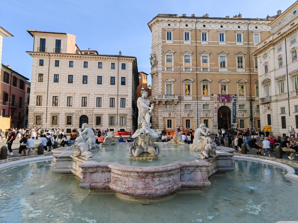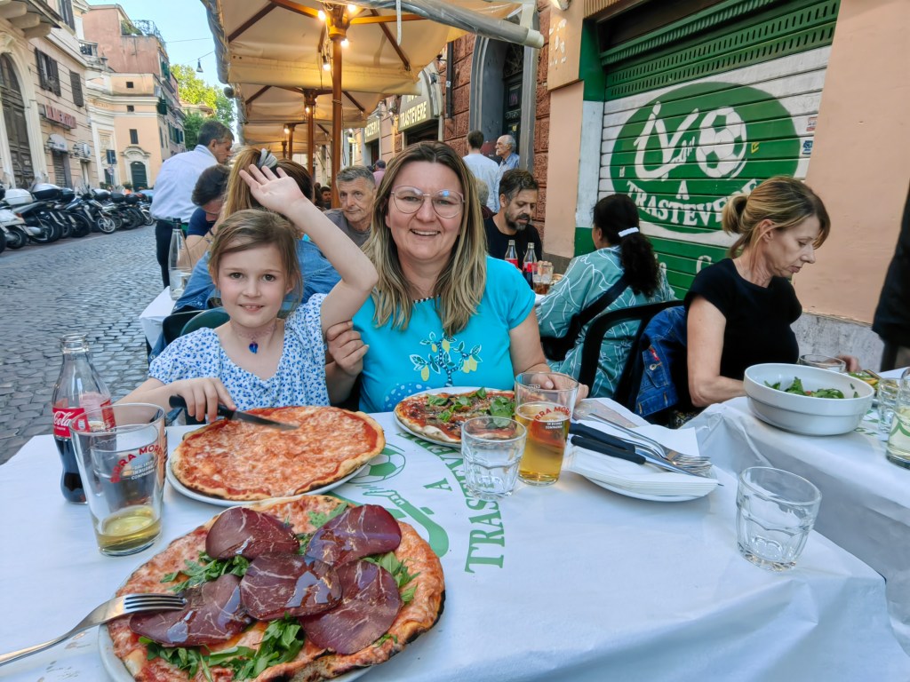 V prvem rimskem popoldnevu smo se tako najprej ustavili ob impozantnem rimskem amfiteatru in si poskušali predstavljati kakšno čudo sveta je le-ta predstavljal pred približno 2000 leti, ko je bil zgrajen in je nudil prostor več kot 50.000 ljudem, željnih kruha in iger. Notri si ga nismo ogledali, saj je bila kar dolga vrsta za vstop, naš obisk Rima pa je bil časovno relativno omejen in smo želeli videti čim več od samega mesta. Od Koloseja smo se sprehodili mimo Palatinskega griča in rimskega Foruma do kapitolskega griča in uživali v razgledih, ter tako podoživljali čare starega Rima. Potem smo zakorakali v ulice centralnega dela, ki se naslanja na desni breg reke Tibere, tam pa najdemo precej oblegano slovito cerkev in grobnico Pantenon. Kasneje se sprehodimo še do Piazza Navone s slikovitim vodnjakom obkroženo z bari in restavracijami ter do nam zelo simpatičnega trga Campo de’ Fiori, kjer priporočamo kakšen Aperol Spritz v pozno popoldanskem soncu. Tempo je bil kar hud, zato smo se večkrat usedli in popili kakšno osvežilno pijačo. Ker smo imeli še nekaj energije smo se odločili, da jo mahnemo čez Tibero na drugo stran proti rimski bohemski četrti Trastevere, ki je po našem mnenju vredna obveznega obiska, tako kot Kolosej ali Vatikan. Imeli smo dober timing, saj je bilo malo po sedmi uri zvečer, ko se počasi polnijo restavracije, mi pa smo si zaželeli pojesti pravo italijansko pico. In smo jo našli v eni od premnogih ulic v piceriji Ivo a Trastevere – priporočamo! Po res napornem dnevu smo preko avtobusa in tramvaja prispeli nazaj v kamp okoli desete zvečer in popadali v posteljo našega Levčka.