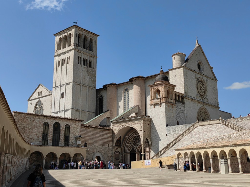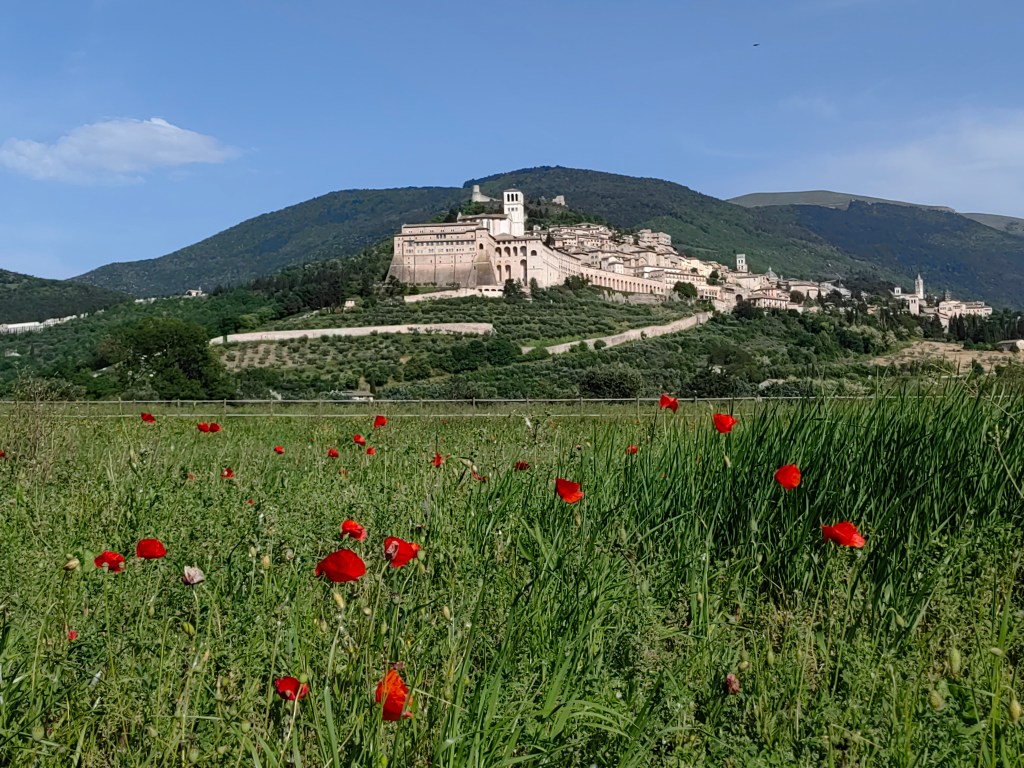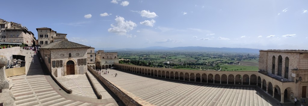 Naslednje jutro, smo si vzeli zelo na ‘izi’, uživali v jutranjem sončku na naši parceli, v miru pojedli zajtrk in porihtali še avtodom. Še dopoldne smo odrinili iz Rima proti romarskemu mestu Assisi, še enemu od krajev, ki so bili zgrajeni na vzpetini. Bojda je mesto rojstni kraj svetega Frančiška, ki je povezan z redom frančiškanov. Na vrhu vzpetine nas je pričakala še ena prečudovita bazilika, ki se imenuje po njem. Sicer pa smo zopet občudovali slikovite uličice, ki so imele tudi omejen dostop z avtomobilom, zato smo avtodom pustili na parkirišču za avtodome, ki je lociran ob vznožju hriba ob avtobusni postaji. Omogočajo tudi plačilo po urni postavki (2 eur/h oz. 14 eur/24h). Tam tudi priporočamo gostilno Osteria San Vittorino, kjer ponujajo različne, tipično umbrijske jedi, bazirane na testeninah in svinjskem mesu. Imajo tudi bogato zbirko lokalnih in mednarodnih vin. Do vrha vzpetine smo sicer potem šli kar peš in se pošteno zadihali, saj vročina še kar ni pojenjala.